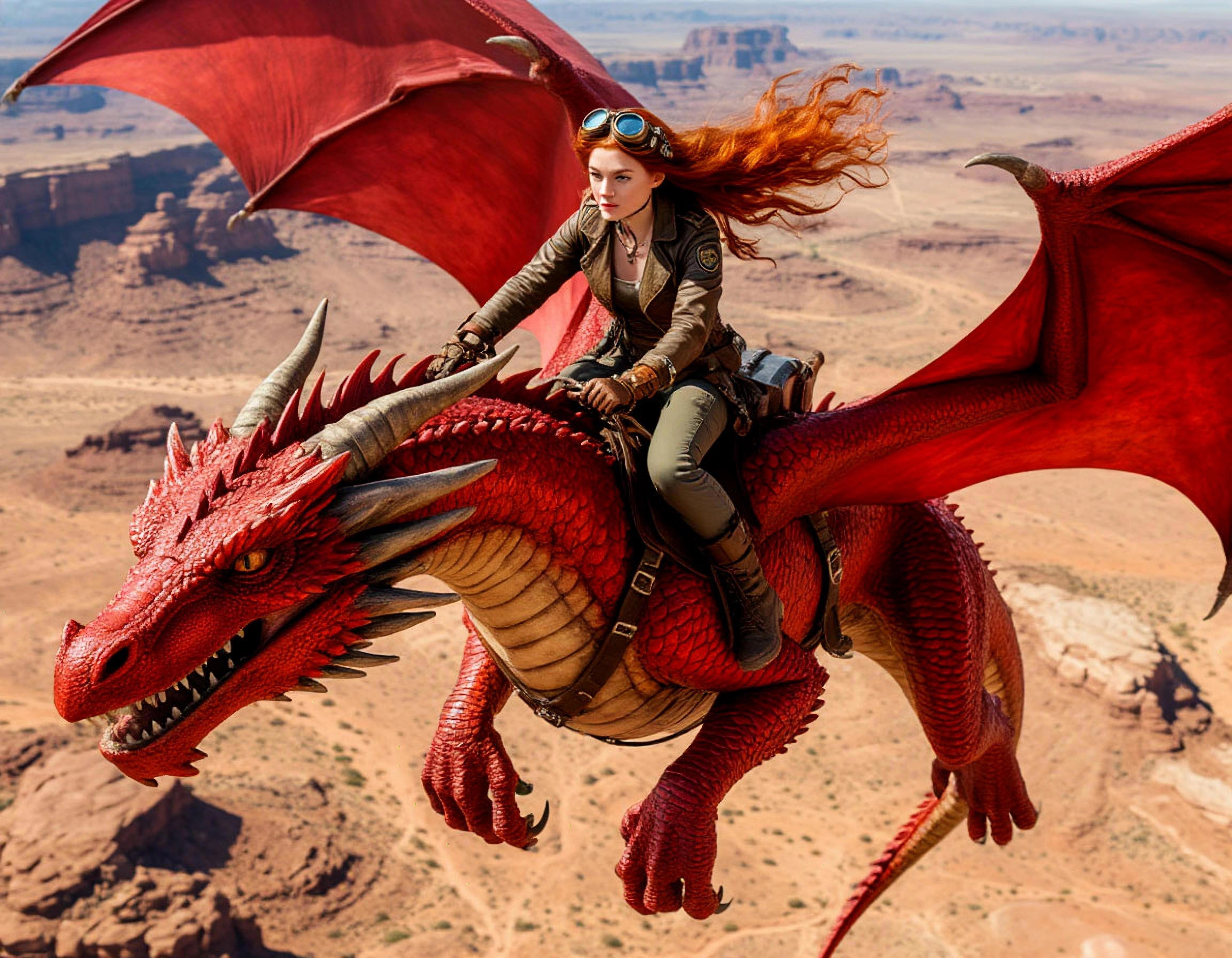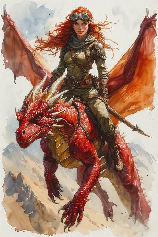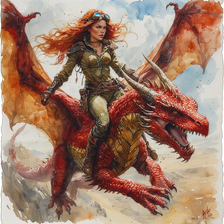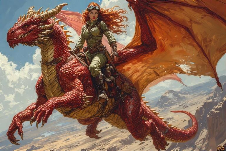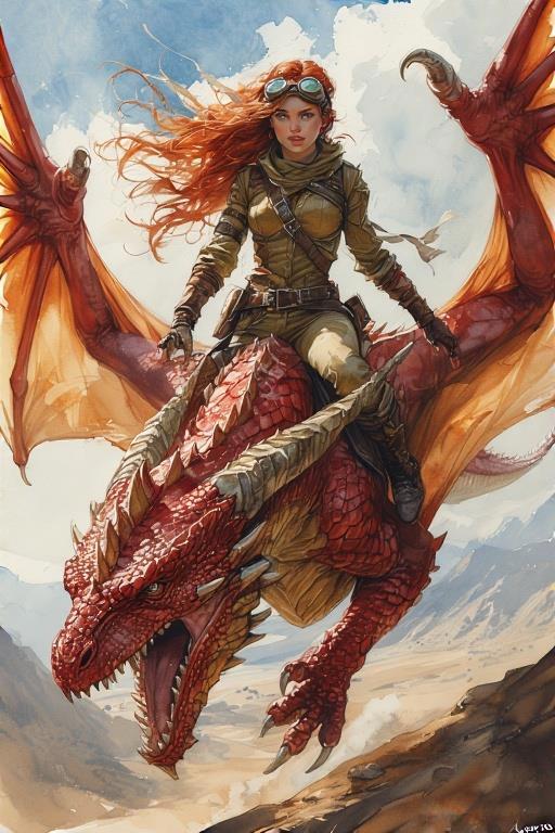 Промт: Epic, action fantasy. A beautiful rider (fine European features, very long red hair flowing in the wind, flying goggles on her head, tight khaki fantasy pantsuit and leather boots) flies over a mountain desert riding a magnificent red and gold dragon (large wings, detailed scales, sharp claws, impressive horns). D&D, high detail, digital painting, sharp focus, fantasy art, illustration, 8k, in the style of Greg Rutkowski. This is an absolute world-class masterpiece. It is an aesthetically pleasing work with impeccable attention to detail and impressive composition.