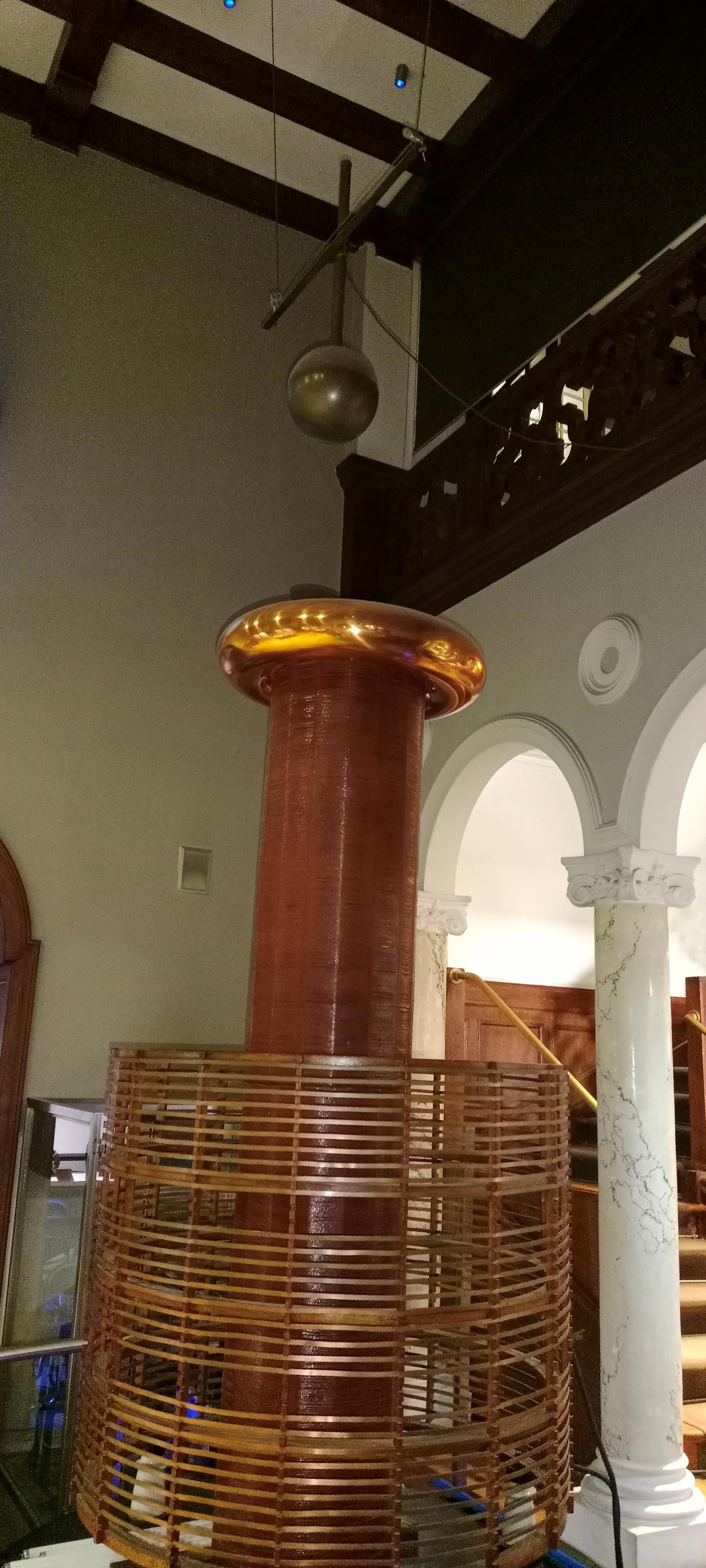 После фильма экскурсовод показывает опыты на тесловском оборудовании. Самый впечатляющий опыт следующий. Экскурсовод раздаёт желающим люминесцентные трубки. Потом запускает трансформатор Теслы, вот этот: