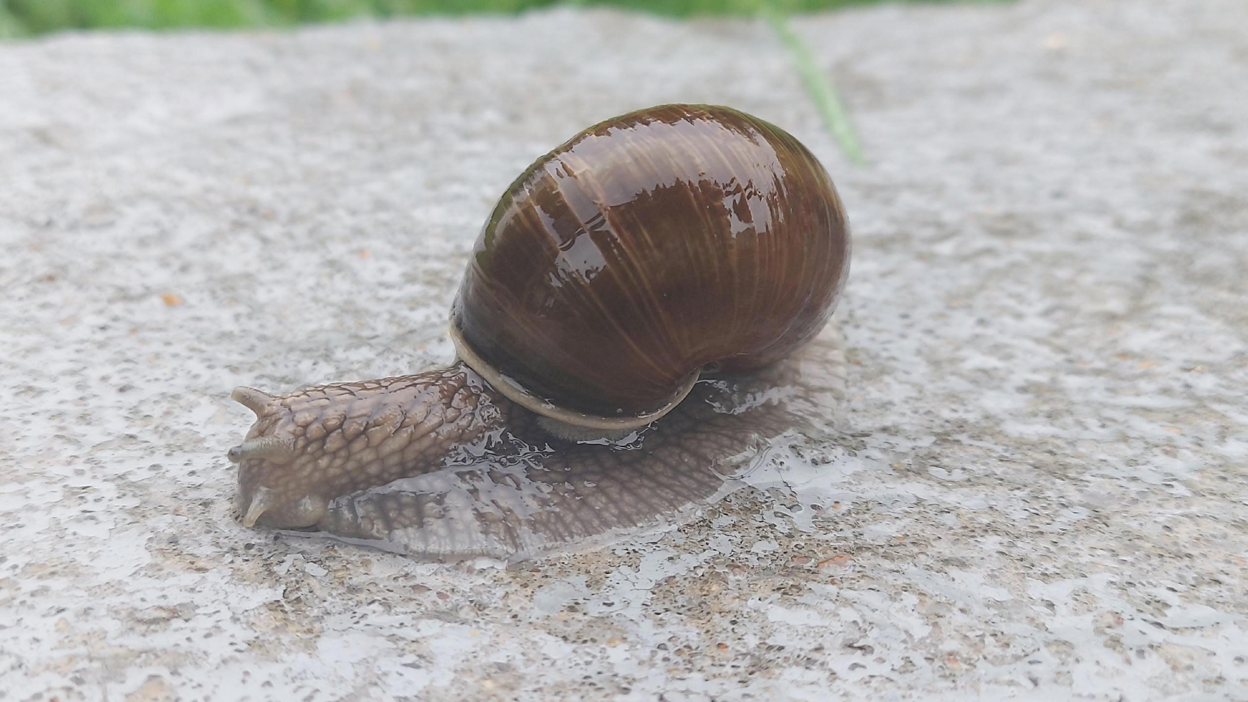 Я шёл себе в наушниках, как обычно, под зонтом, естественно (хотя ни фига он меня не спас), и... взгляд наткнулся на камне сначала. Приглянулся - улитка! Большая!
