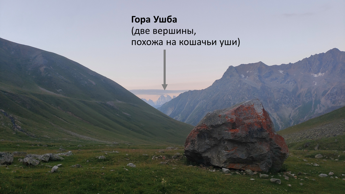 Как я и говорила, подсказки были на каждом фото. Давайте начнём с самого мими-мишного. По центру вдали видите гору с двумя вершинами, похожими на кошачьи уши? Это гора Ушба, находится в Грузии, вблизи города Местиа. Но уж больно она далеко на фото, верно? Значит, фото сделано на Кавказе, но вряд ли из Грузии.
