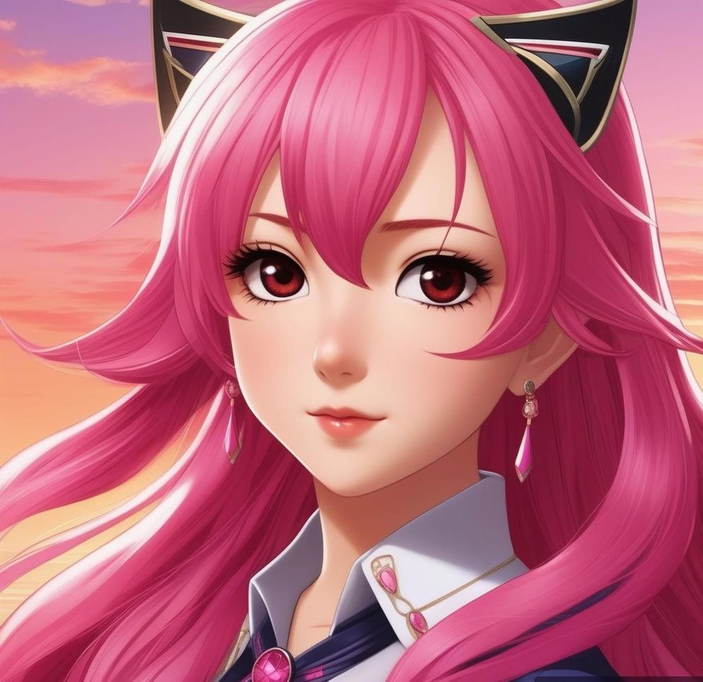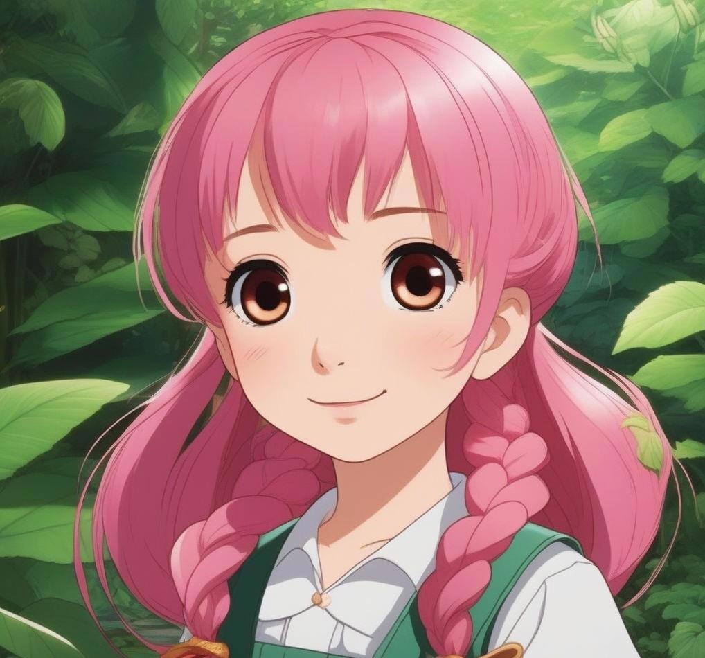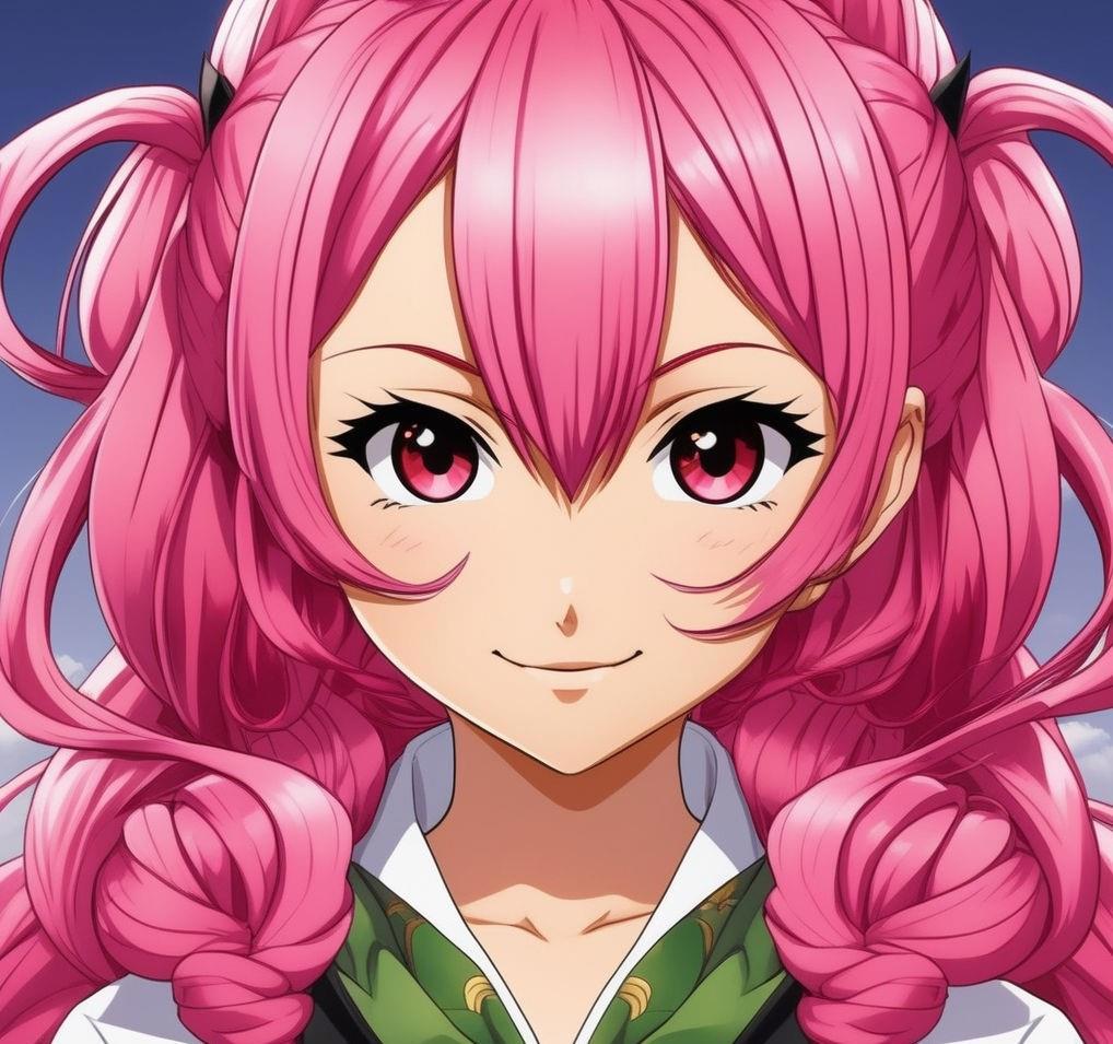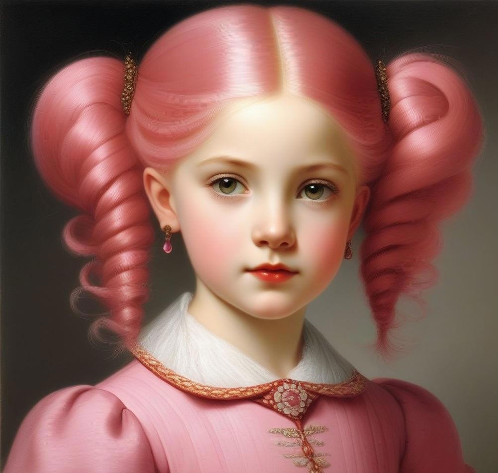 Семилетняя девочка с розовыми волосами, собранными в вытянутые остроконечные пучки, от которых отходят два очень пышных, но коротких хвоста, и большими красными глазами