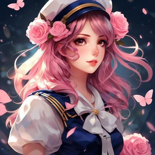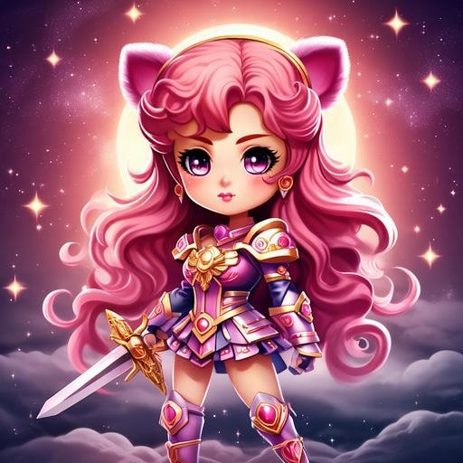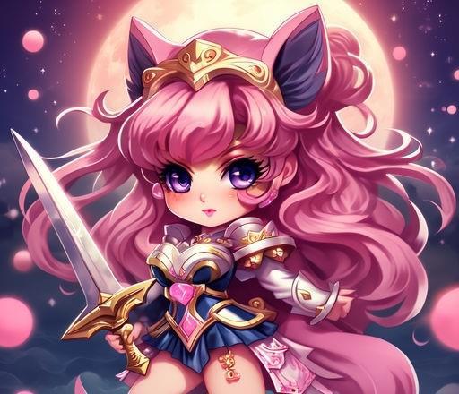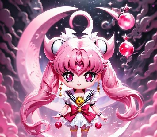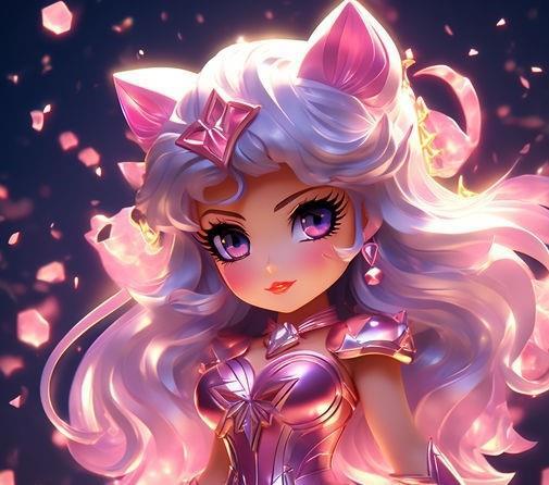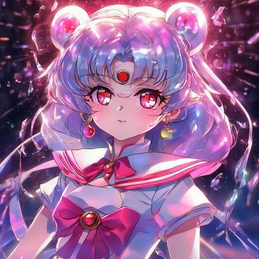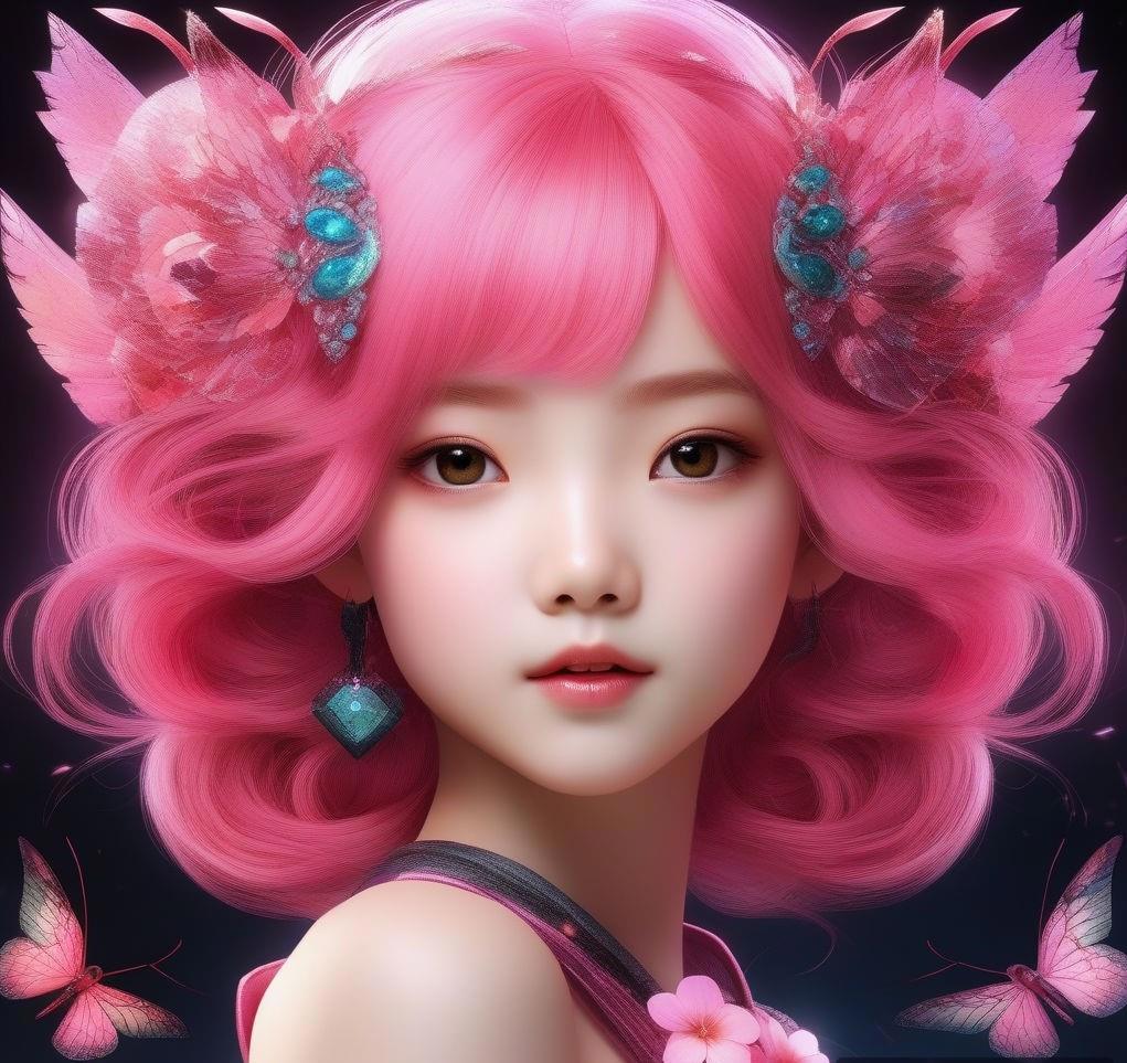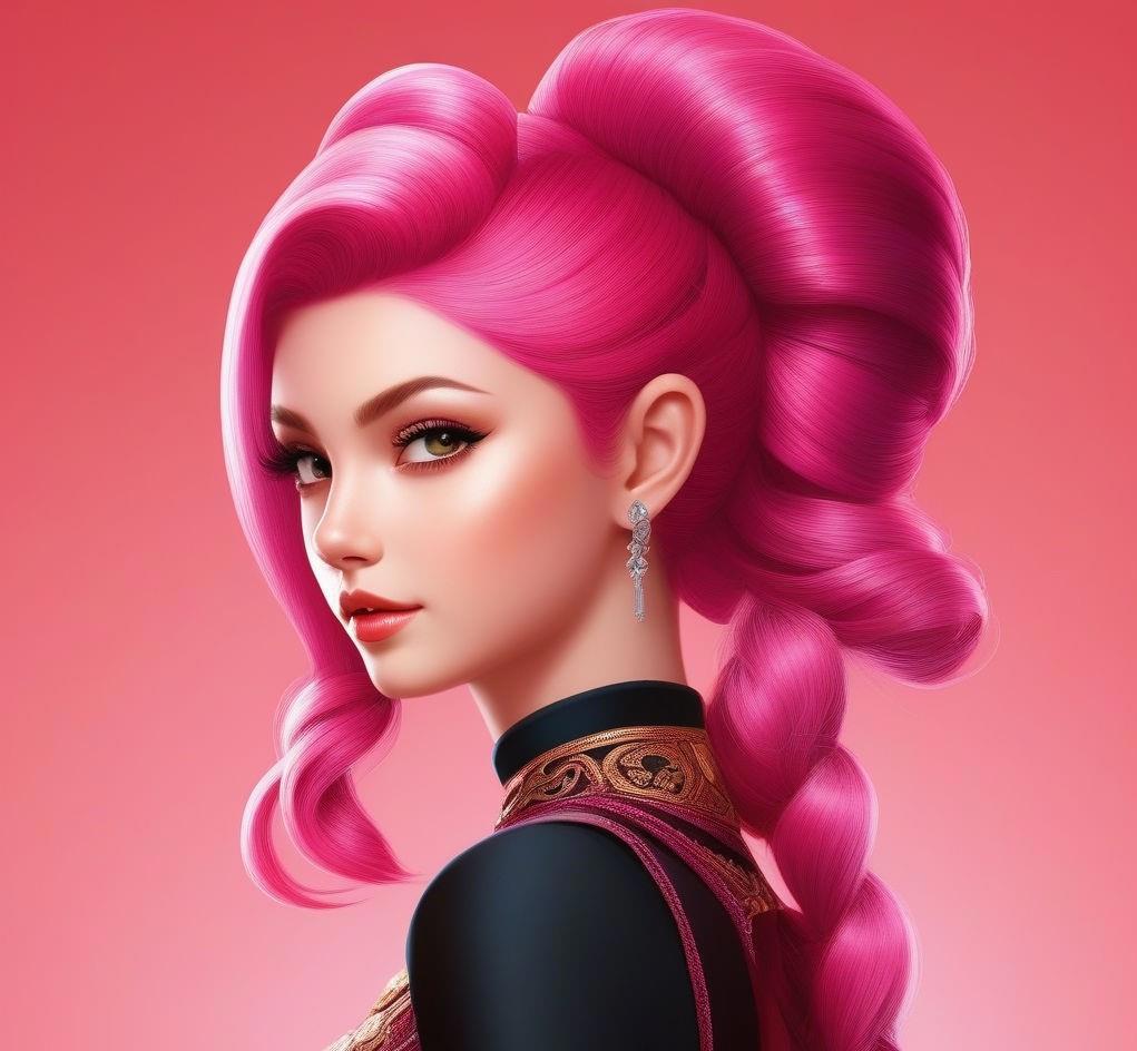 Семилетняя девочка с розовыми волосами, собранными в вытянутые остроконечные пучки, от которых отходят два очень пышных, но коротких хвоста, и большими красными глазами
