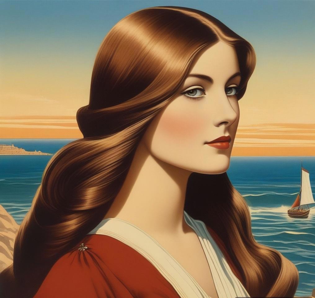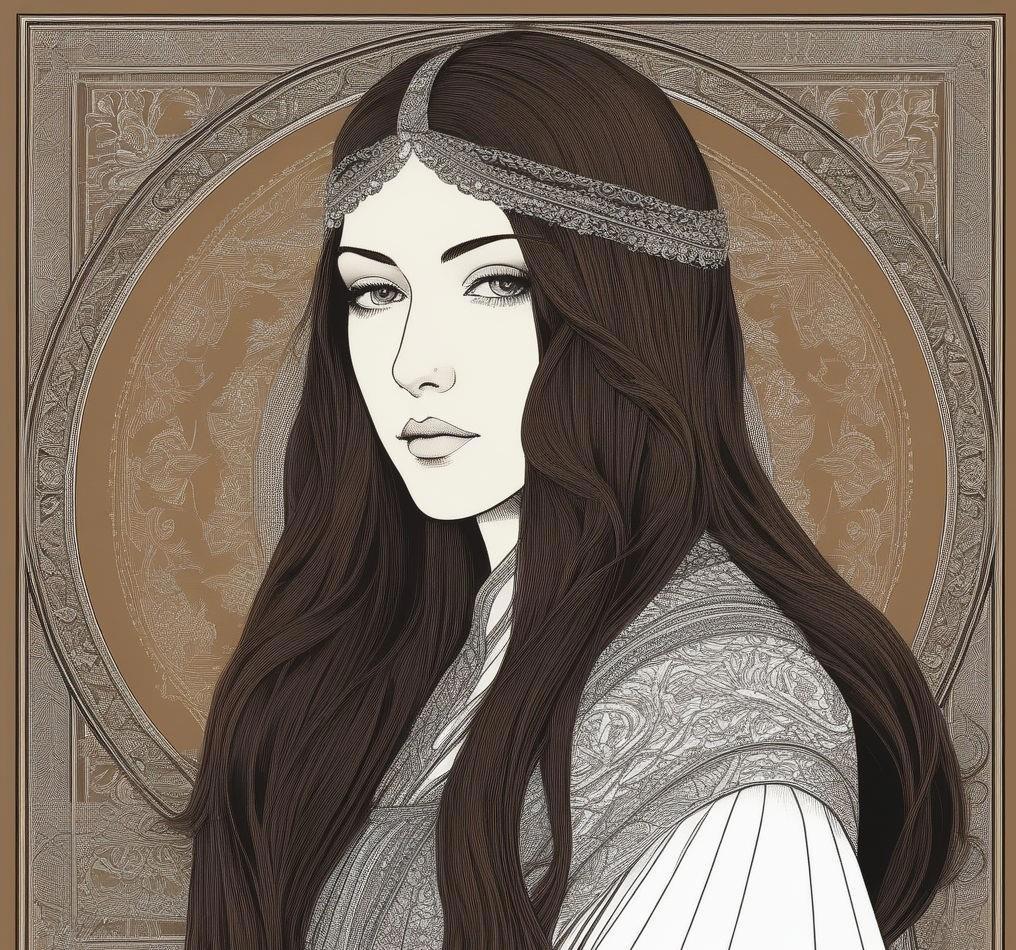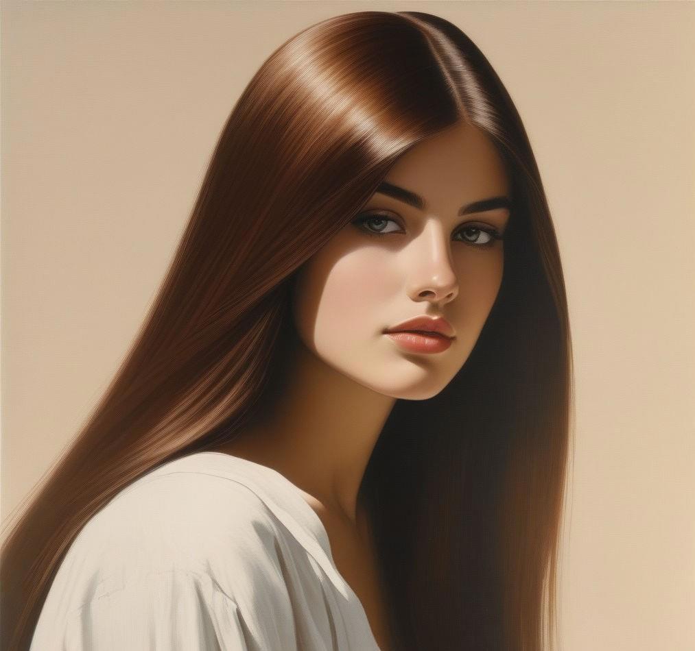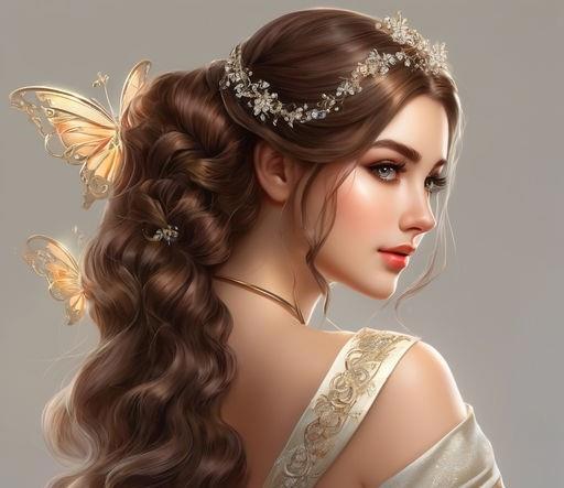 двадцатилетняя девушка длинные прямые волосы, каштановые с рыжинкой, разделенные на две части и заколотые на затылке таким образом, что образуют кольца почти до плеч. Свободные концы спускаются на грудь и доходят до колена. Светло-карие глаза