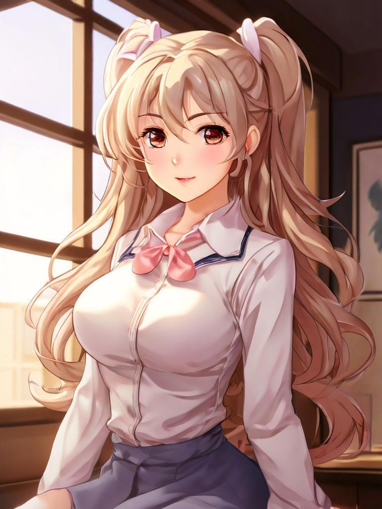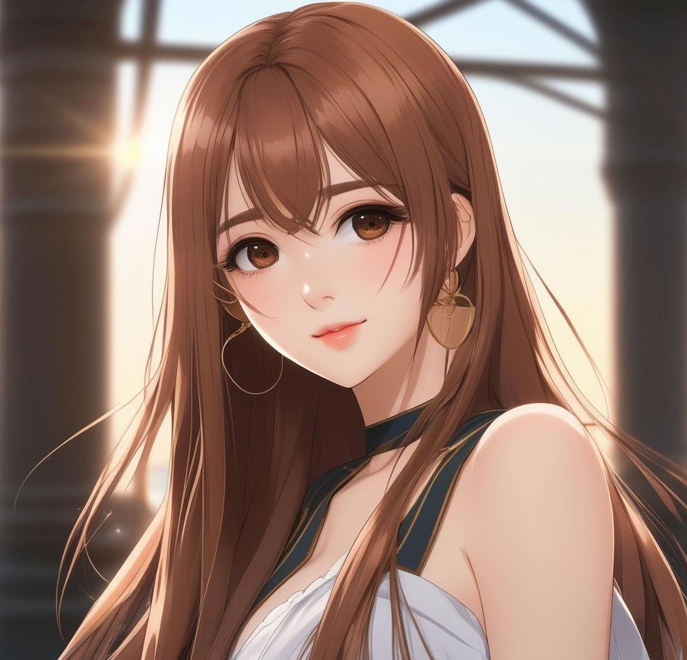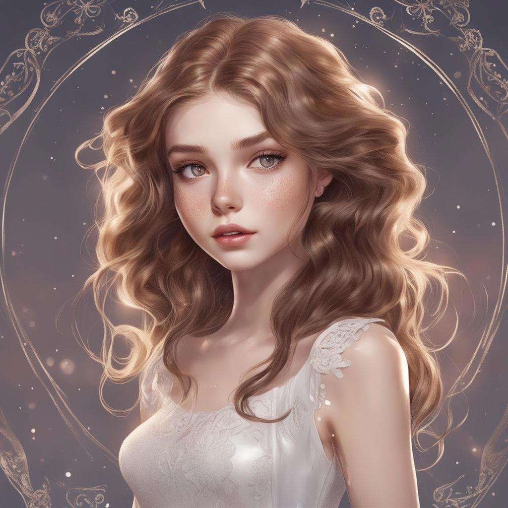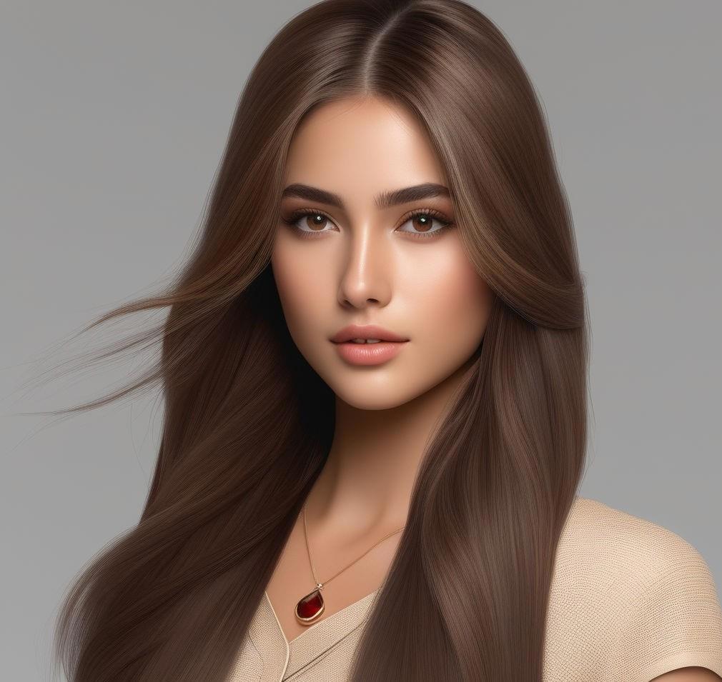 двадцатилетняя девушка длинные прямые волосы, каштановые с рыжинкой, разделенные на две части и заколотые на затылке таким образом, что образуют кольца почти до плеч. Свободные концы спускаются на грудь и доходят до колена. Светло-карие глаза