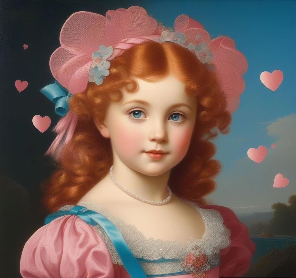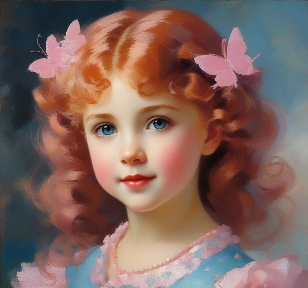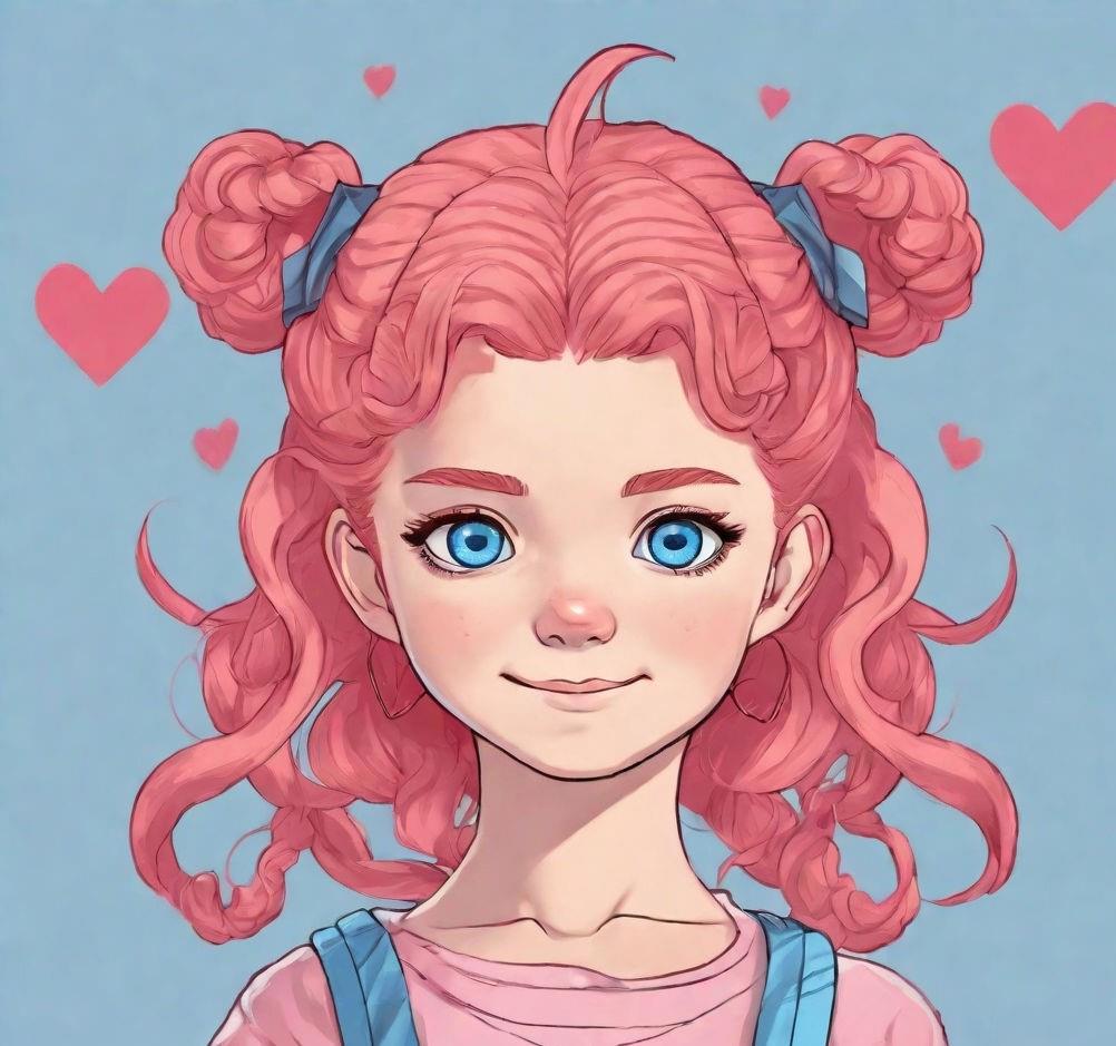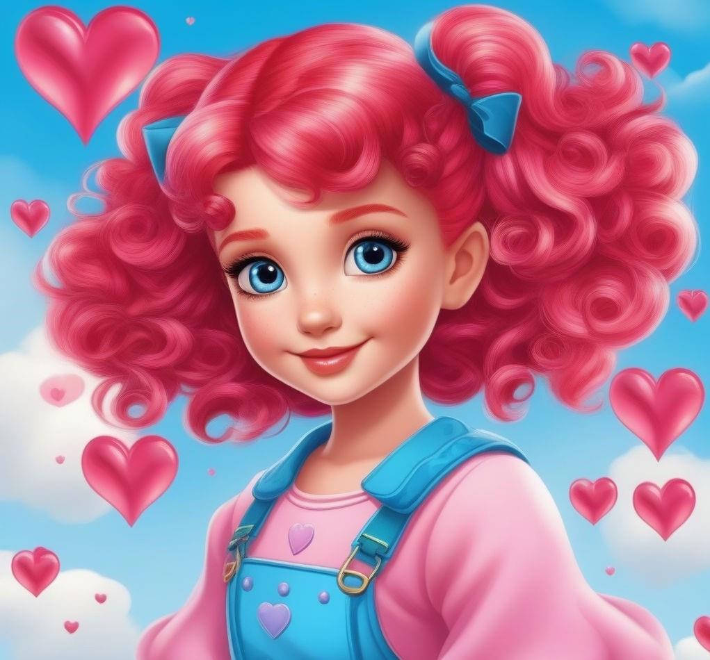 пятилетняя девочка с волосами красно-розовыми, с пучками на голове в виде сердечек, от которых отходят тонкие короткие вьющиеся хвостики. Небесно-голубые глаза