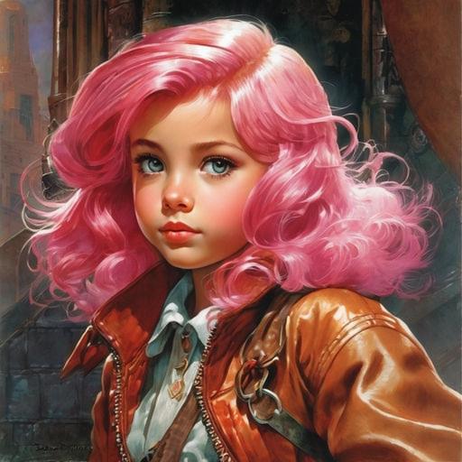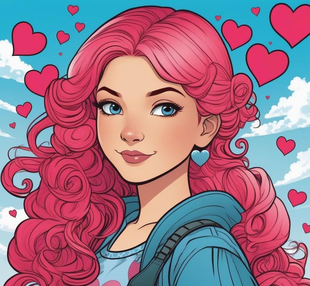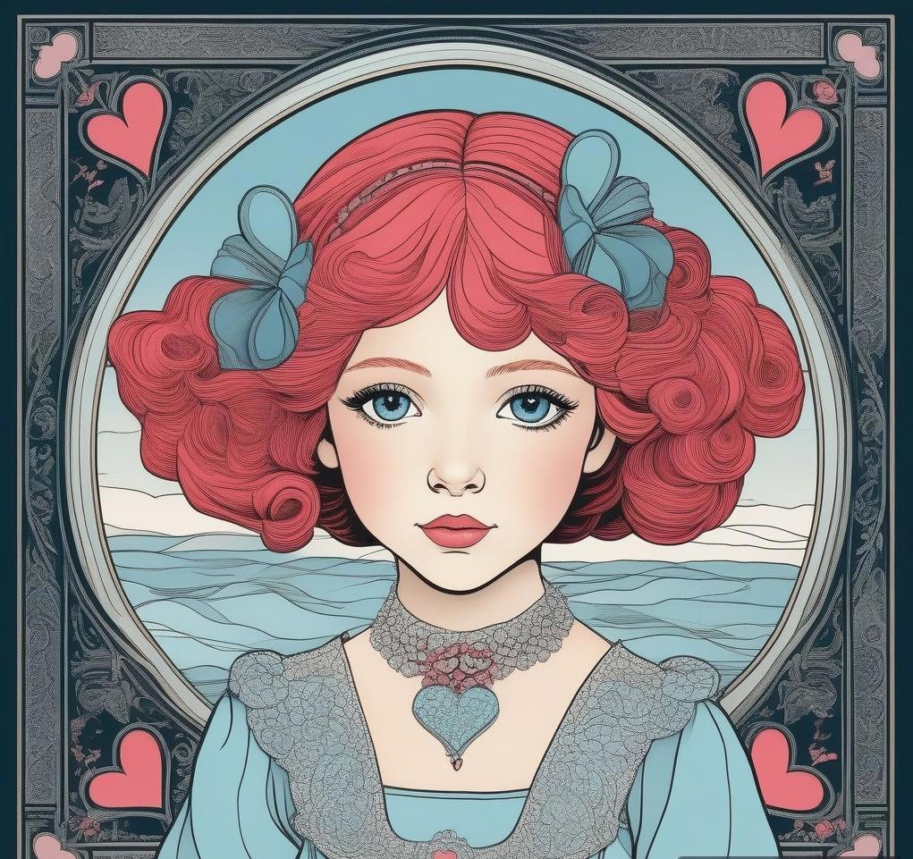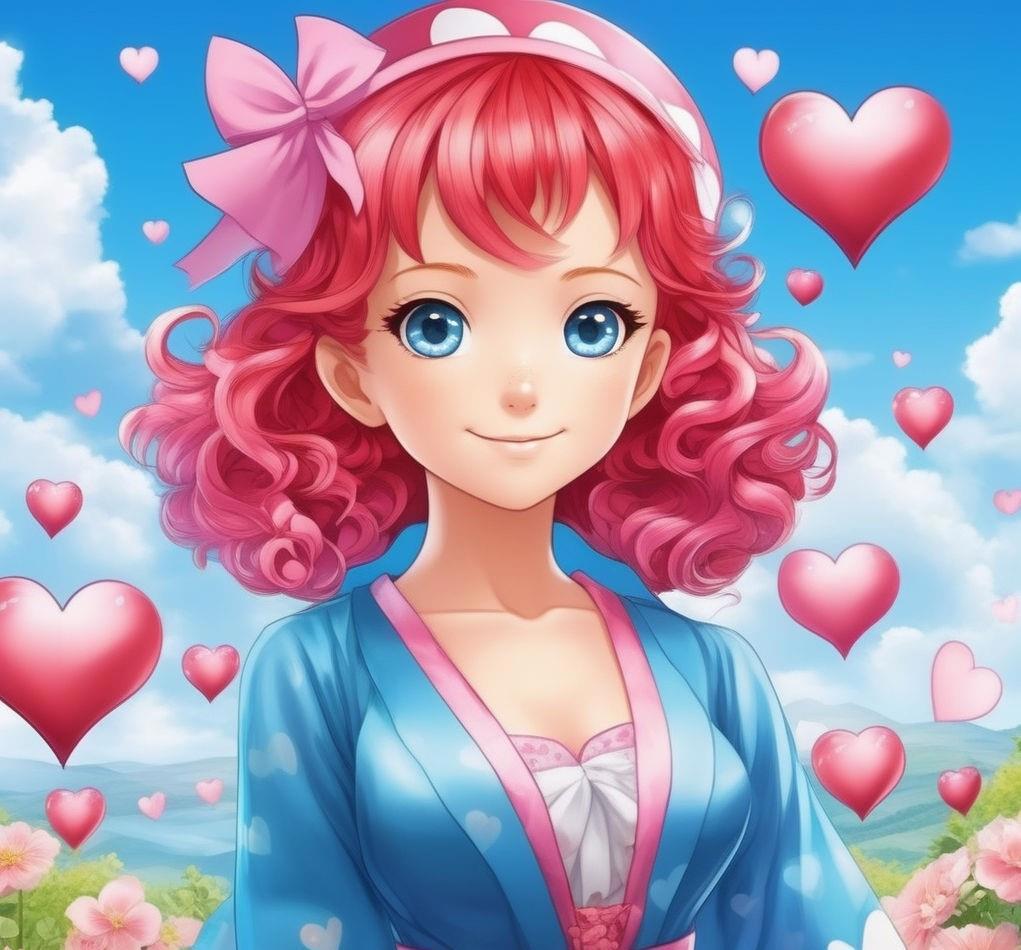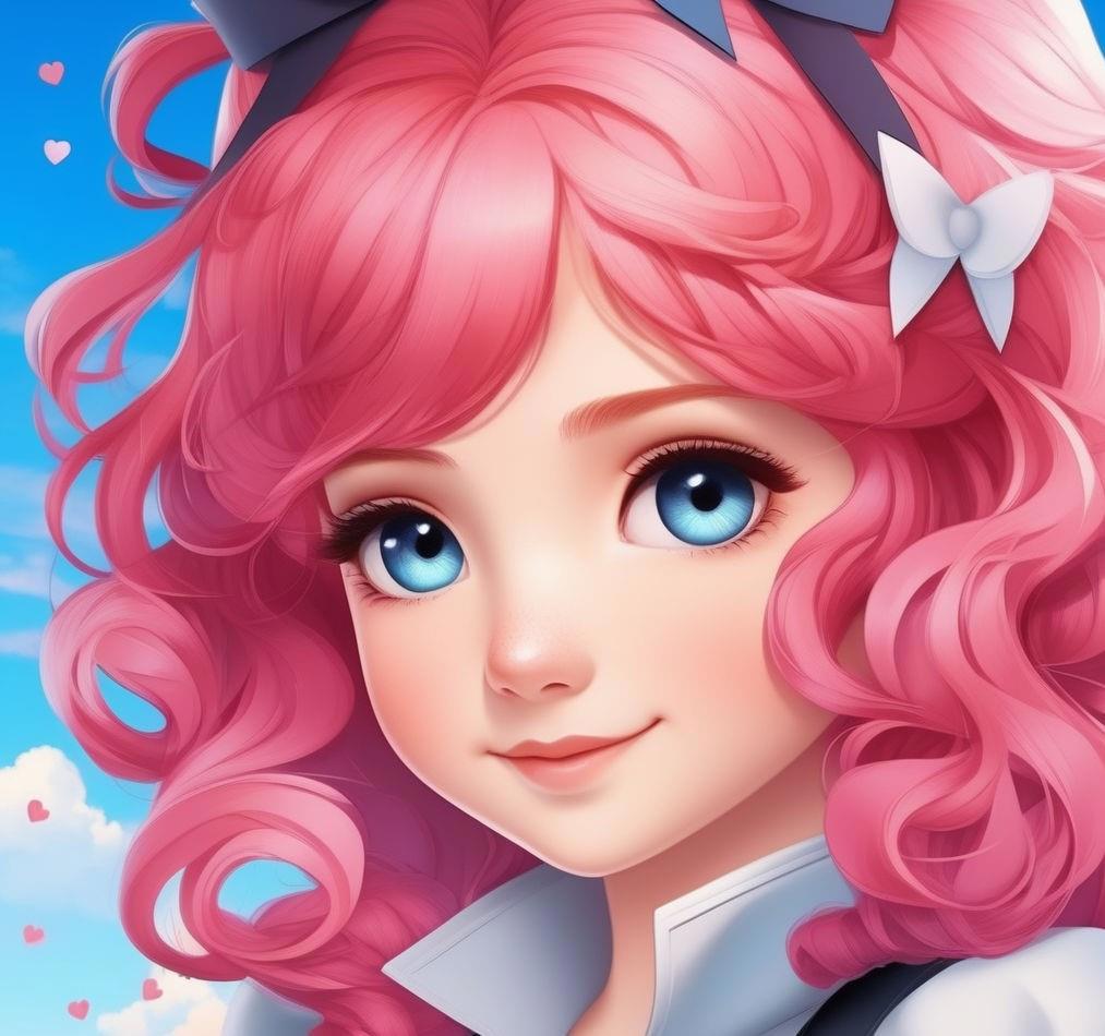 пятилетняя девочка с волосами красно-розовыми, с пучками на голове в виде сердечек, от которых отходят тонкие короткие вьющиеся хвостики. Небесно-голубые глаза