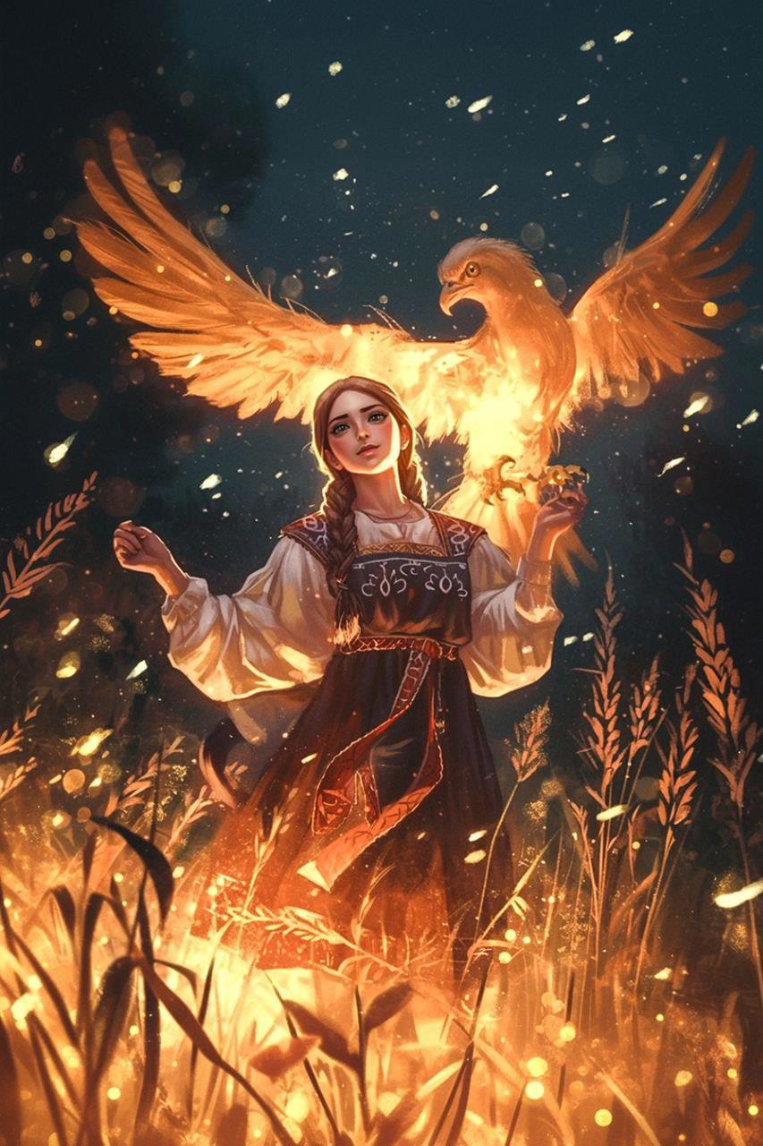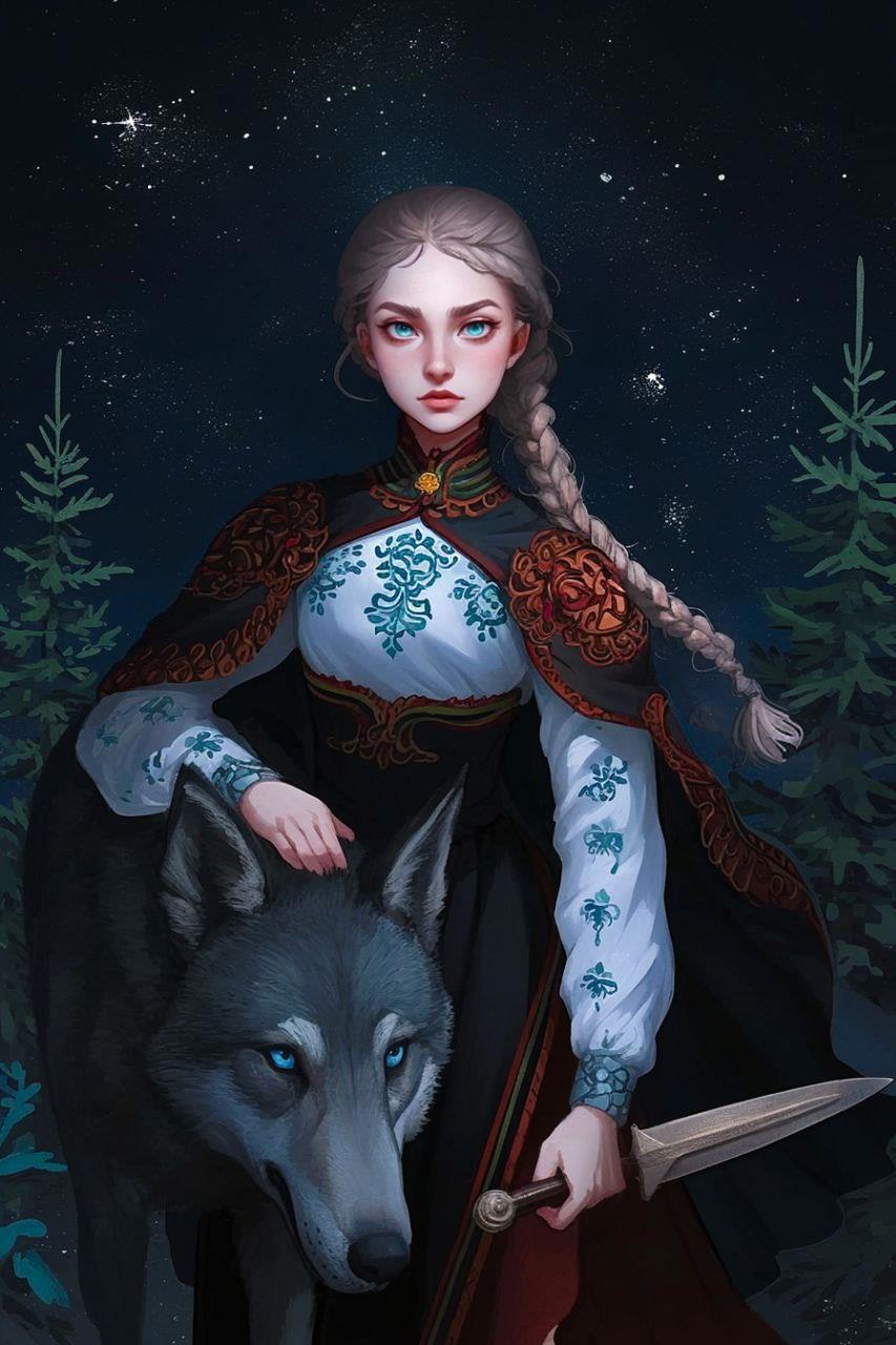 Сейчас я пишу новую историю, и с ней тоже произошло нечто похожее. Пока она условно называется "Враново перо", и в моей голове она вся соткана из элементов и атмосферы русских волшебных сказок. Обожаю их с детства, вот это сочетание жути и волшебства - моё! А ещё юмор, он ведь там тоже есть (мне особенно про серого волка нравится, который в третий раз на дело сам пошёл вместо дурака царевича). И эти образы так долго зрели и кружились в моей голове, что-то зацепилось из песен, что-то из изучения фольклора и мифологии. Однажды увидела у артера две картинки и забрала разом обе - видимо, будут иллюстрациями, ясно же, что это мои герои.