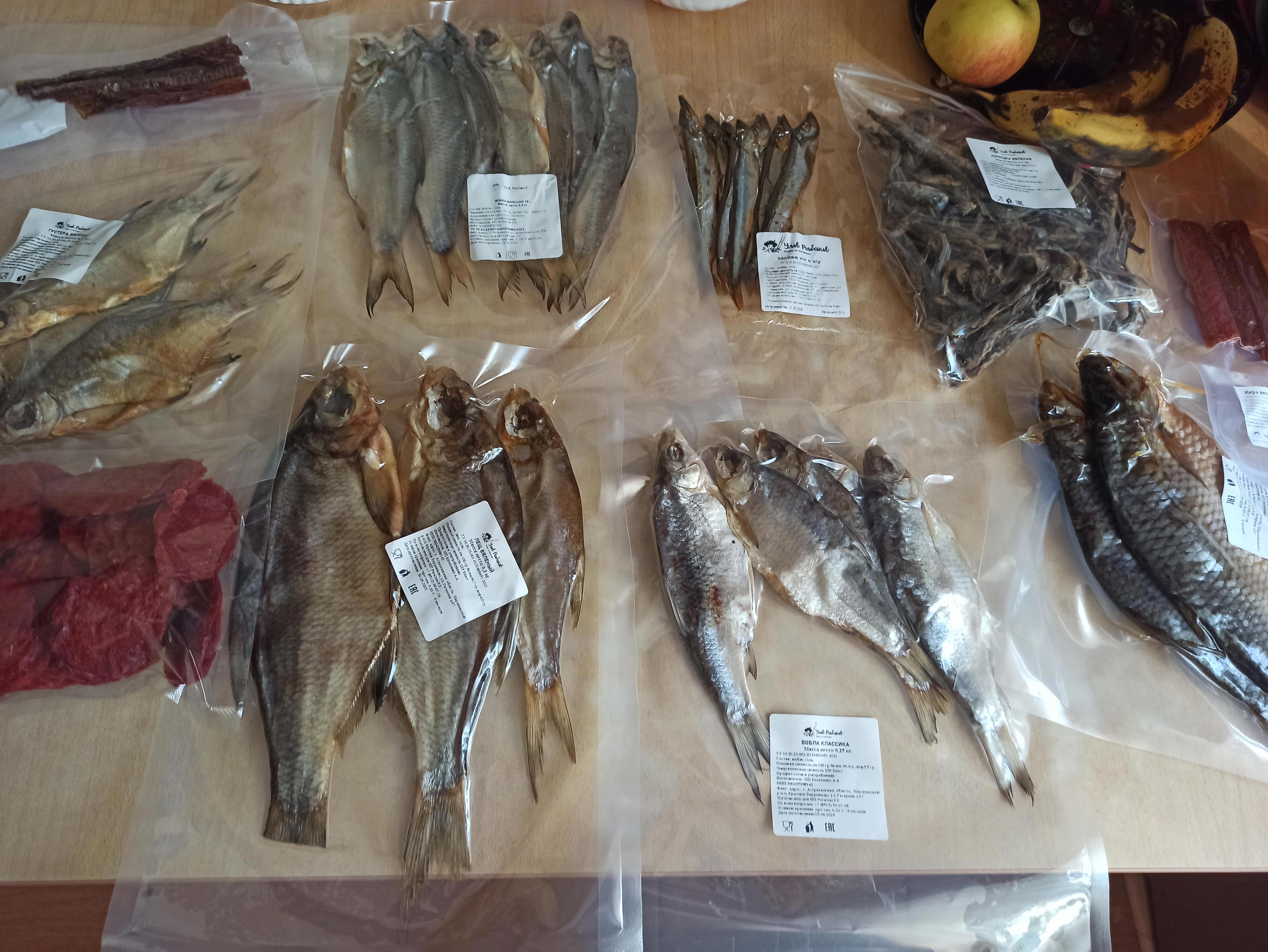 Итак. Посылка содержала в себе: лещ вяленый, вобла классика, вобла вяленая, густера, красноперка, мойва холодного копчения, палочки икры, корюшка вяленая, соломка воблы копченая и чипсы из красной рыбы.