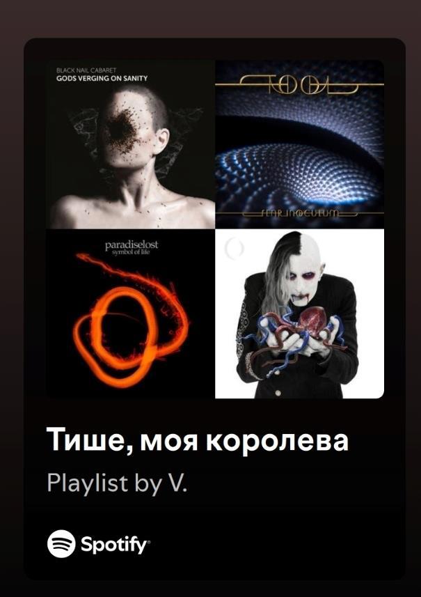 Автор: Яна ВетроваХочу всё-таки поделиться плейлистом к «Тише, моя королева». Да, он странный, может быть, книга совсем не такие ассоциации вызывает. Но я писала под него, и в принципе, можно догадаться, какие песни соответствуют каким сценам или персонажам)