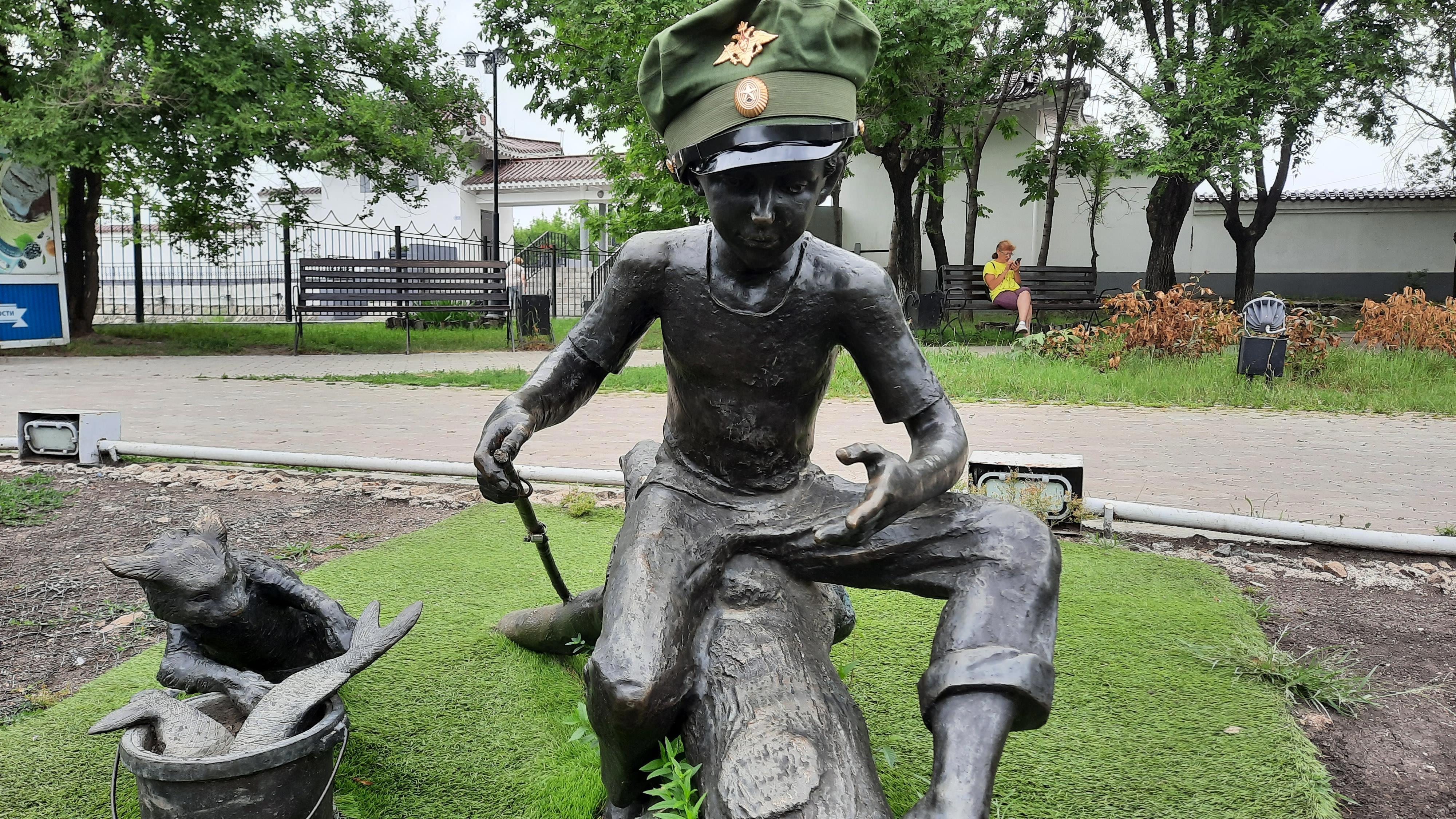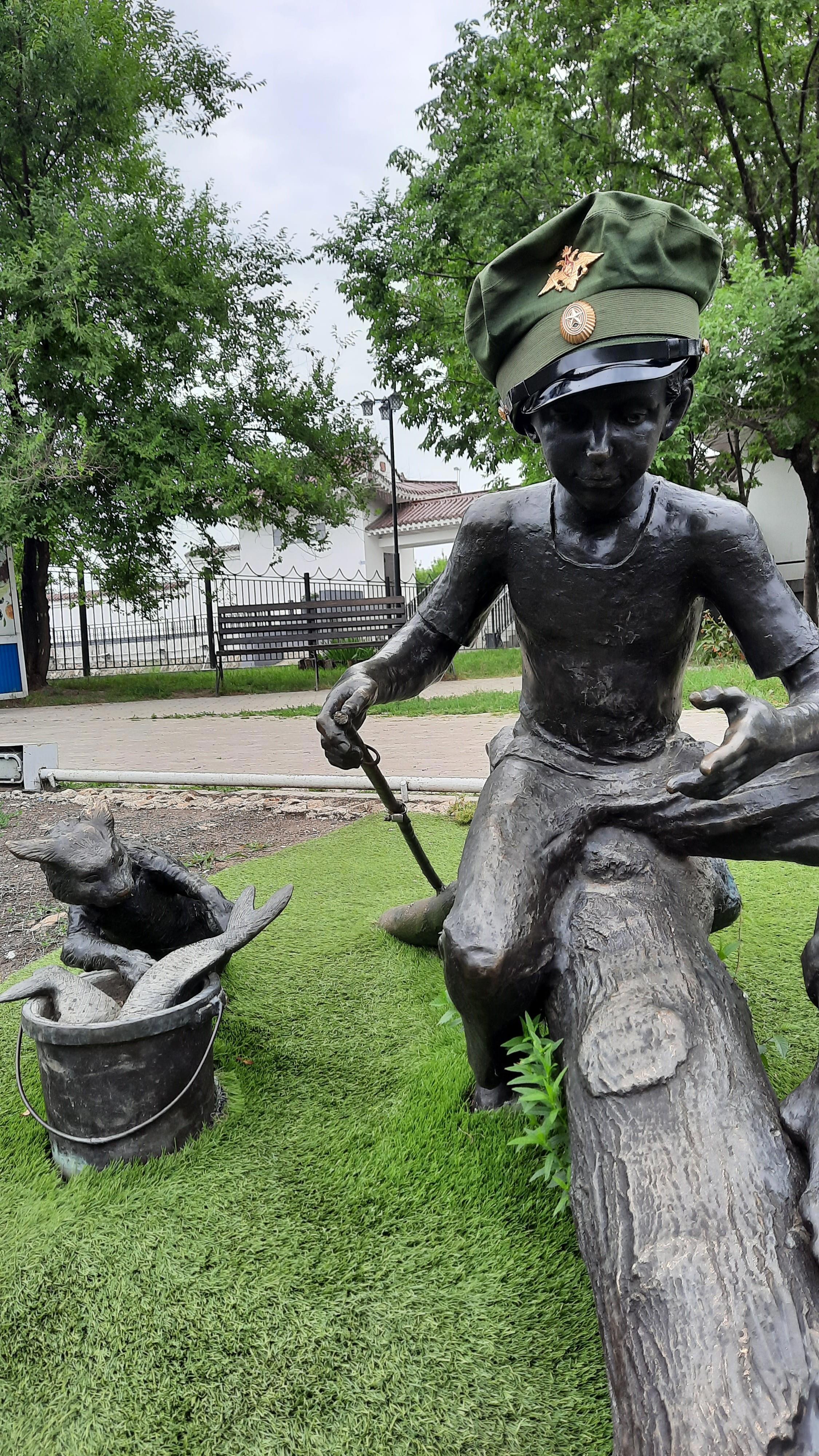 29.07.25 "Рыбачок с котом"... Граждане украсили скульптуру (в компенсацию за сломанную удочку?)