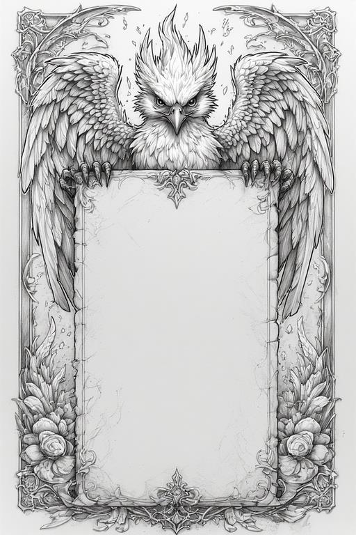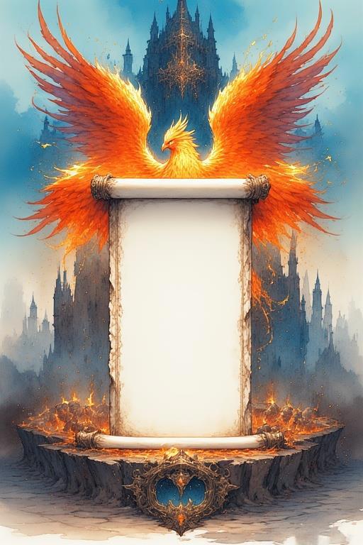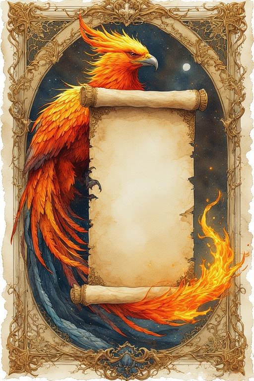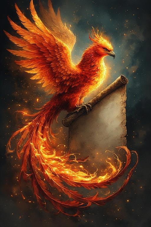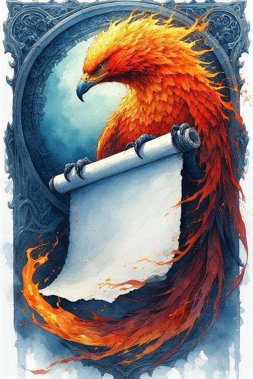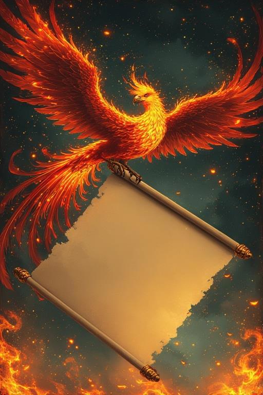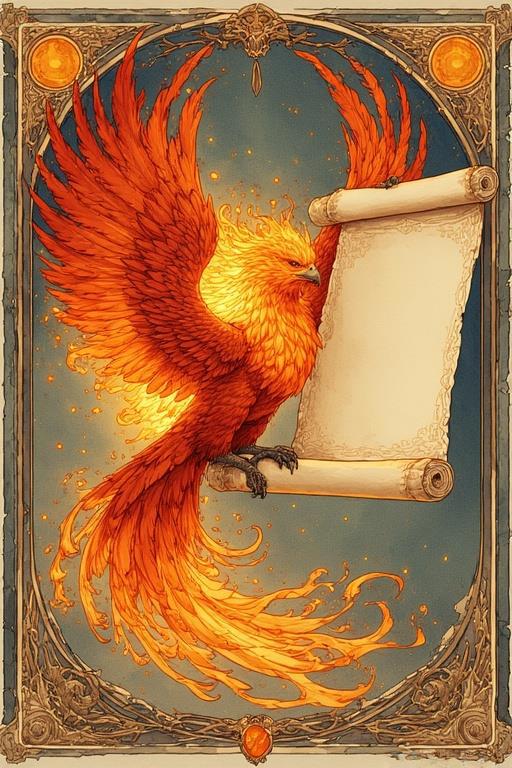 Промт: Detailed illustration. Beautiful fire phoenix holding a large empty (no text) vertically open scroll in its paws, fantasy, high detail, complex, digital painting, ArtStation, concept art, smooth, sharp focus, Artgerm, Greg Rutkowski and Alphonse Mucha style.