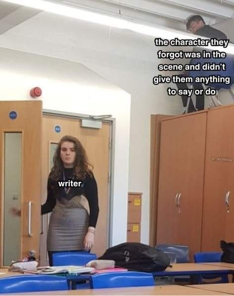 Надпись в углу: «Персонаж, о присутствии которого в сцене автор забыл и не дал ему ни реплик, ни действий».