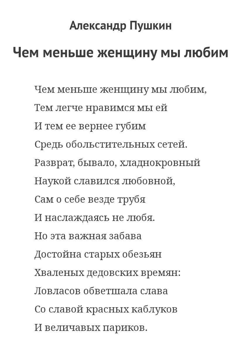 Автор: Irina UrbinaВчера мне кто только не напомнил фразу из "Евгения Онегина" от нашего всего, свет-красно-солнышко-поэзии Сан Сергеича Пушкина. Ну, помните, да? "Чем меньше женщину мы любим, тем легче нравимся мы ей..." Иногда даже читала как-то такое цитирование: "...тем БОЛЬШЕ нравимся мы ей..." Ну, искажения в народе бывают, да, тем более что рифма так или иначе сохраняется.
