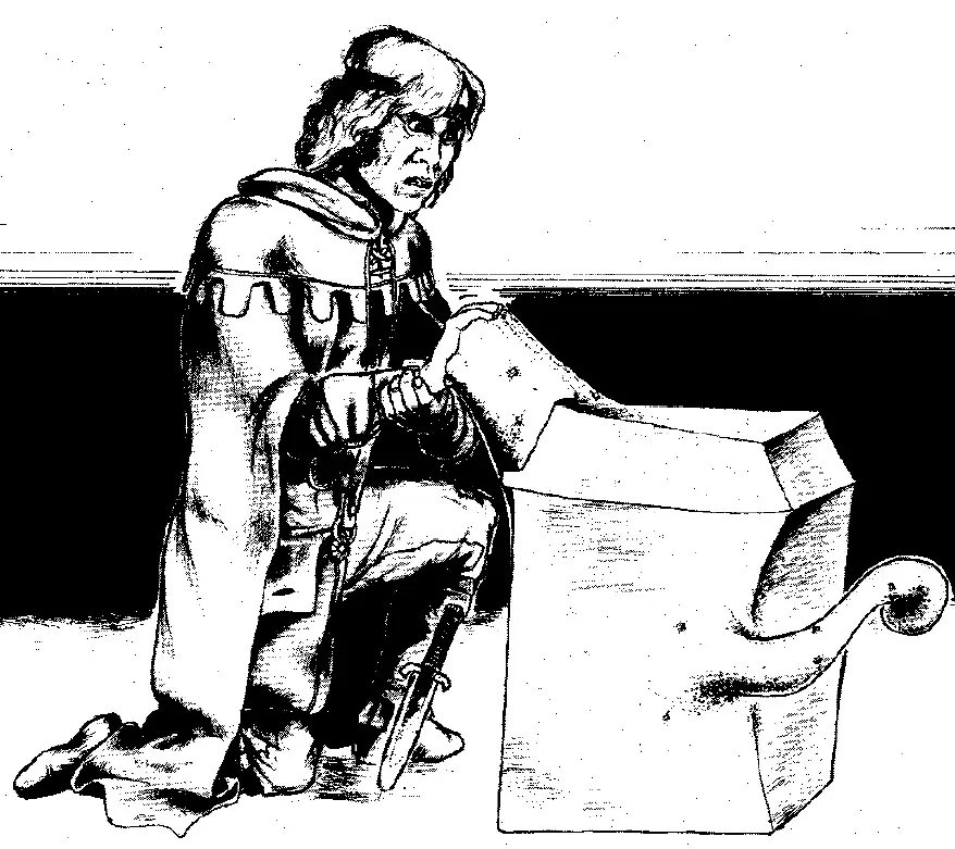Подбежал путник с факелом к сундуку и открыл, приподняв крышку. Только вместо горы золотых монет путник увидел пасть с огромными клыками и языком.