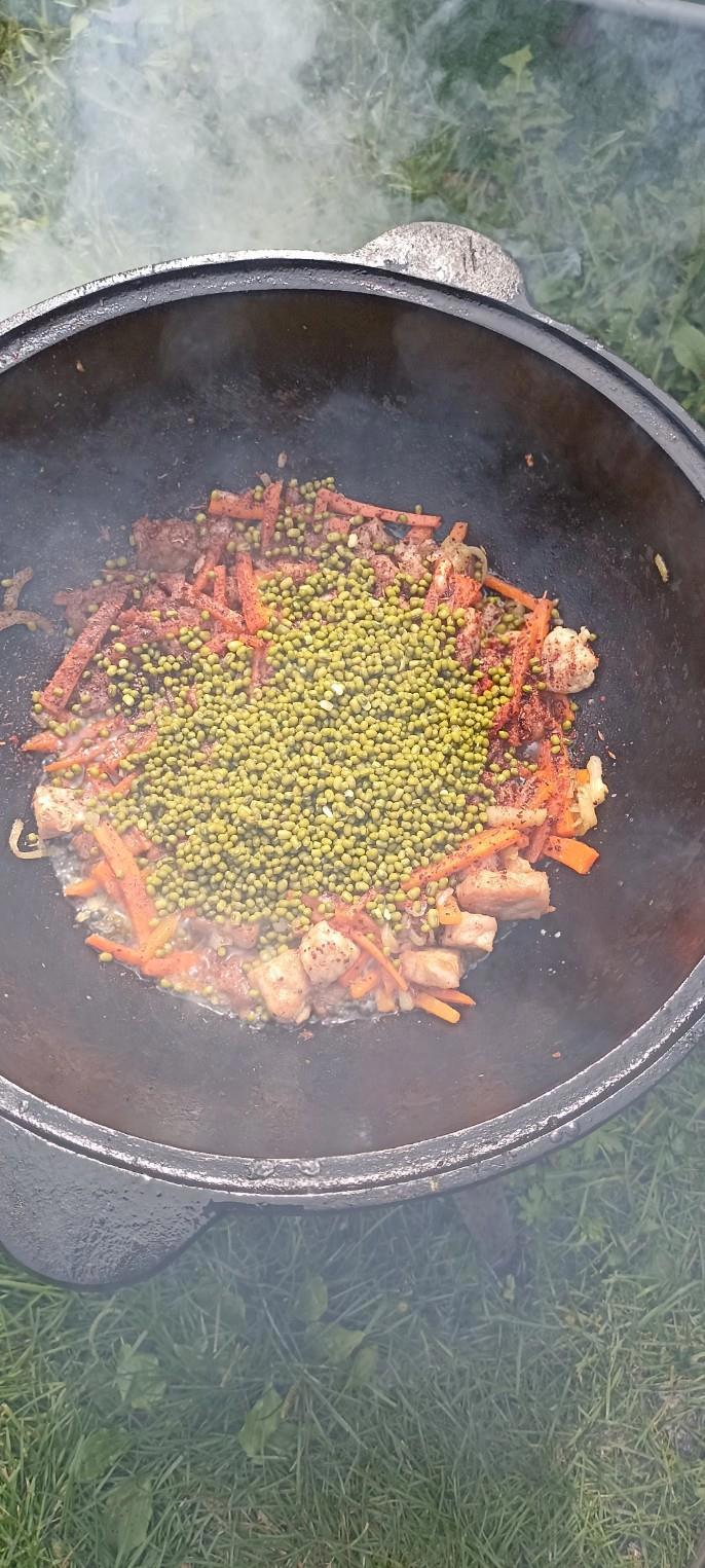И так, морковь у нас готова. Фигачим в казан ПОЛОВИНУ столовой ложки соли (без горки), добавляем туда добротную горсть приправы для плова (зира, шафран, сушеный томат) и всыпаем стакан маша (который заранее нужно подержать часа 2-3 в воде, чтобы он разбух):