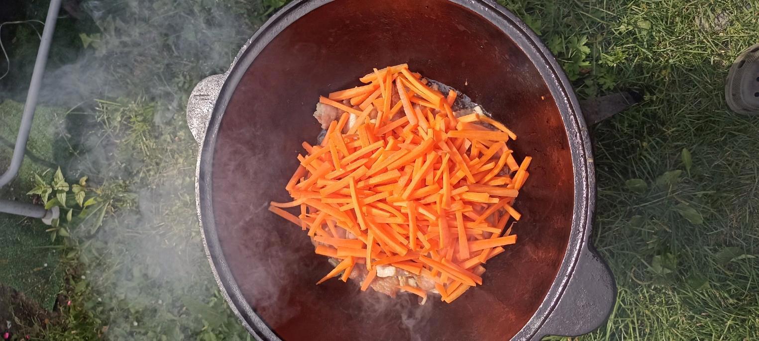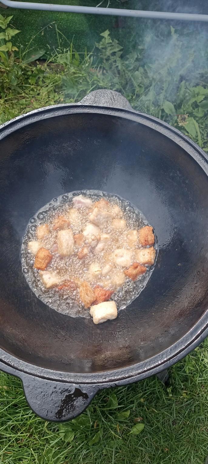 Начал я с того, что разжёг печь, прогрел казан, и закинул в него несколько кусочков сала (не солёное, а только что срезанное с мяса. Граммов сто пятьдесят у меня набралось). Вытопил из него весь жир, убрал шкварки, и жирком хорошенько так стенки казана смочил. Для чего? Заметил, что так в казане никогда ничего не пригорает.