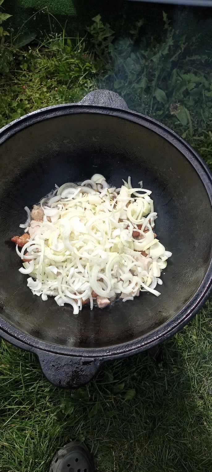 Далее, когда большая часть мяса уже покроется корочкой, в дело идет лук: