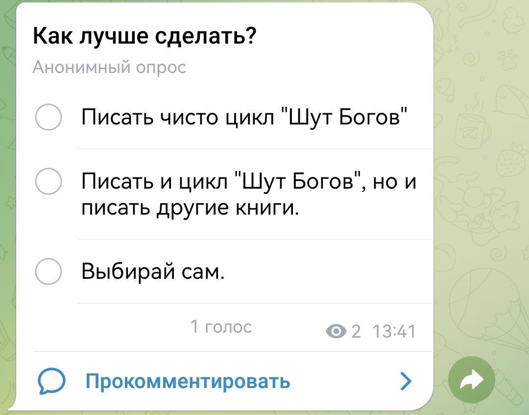 Автор: DetectiveNikolayТак дорогие боги наблюдатели, у меня к вам вопрос. У меня есть ещё много идей для книг(в осном фантастика), вам бы хотелось что бы я сконцентрировался на цикле, или писал в свое удовольствие создавая сразу несколько миров(книг). В тгк едет опрос, вы можете свое мнение выразить здесь в комментариях.