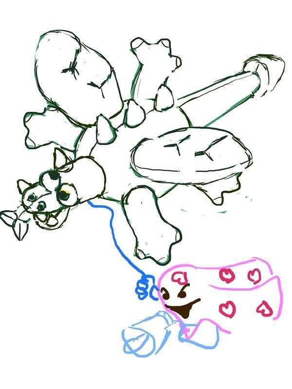 Но это был уже не маленький пухляш, а огромный величественный зверь, и так же величественно он нет, не нёсся, не парил, а буквально плыл, как галеон, торжественно и важно. У него была тупорылая морда с крупными белыми и толстыми зубами, торчащими во все стороны, а ещё из пасти простирался распухший, словно от множественных пчелиных укусов, раздвоенный язык, выпученные из орбит глаза смотрели в разные стороны, так же во все четыре стороны торчали четыре прямые, без единого сустава, лапы с толстыми пальцами плавно переходящими в толстые конусовидные когти с тупыми кончиками. И в обе стороны были широко раскинуты крылья. Крылья не махали, они держались параллельно земле, или даже чуть висели, и каждое крыло было толстым, как хорошо взбитая королевская перина.
