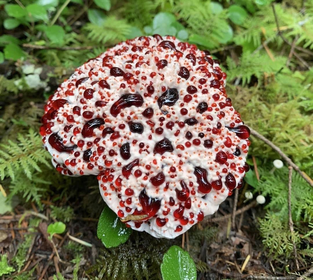 А это, дорогие мои, гриб Гиднеллум Пека. Известен так же под псевдонимом "Клубника и сливки". Первооткрыватель гриба описал его как «похож на датское печенье с клубничным вареньем». Растет под хвойными деревьями. Гриб не ядовит, но не съедобен: очень, очень горький.