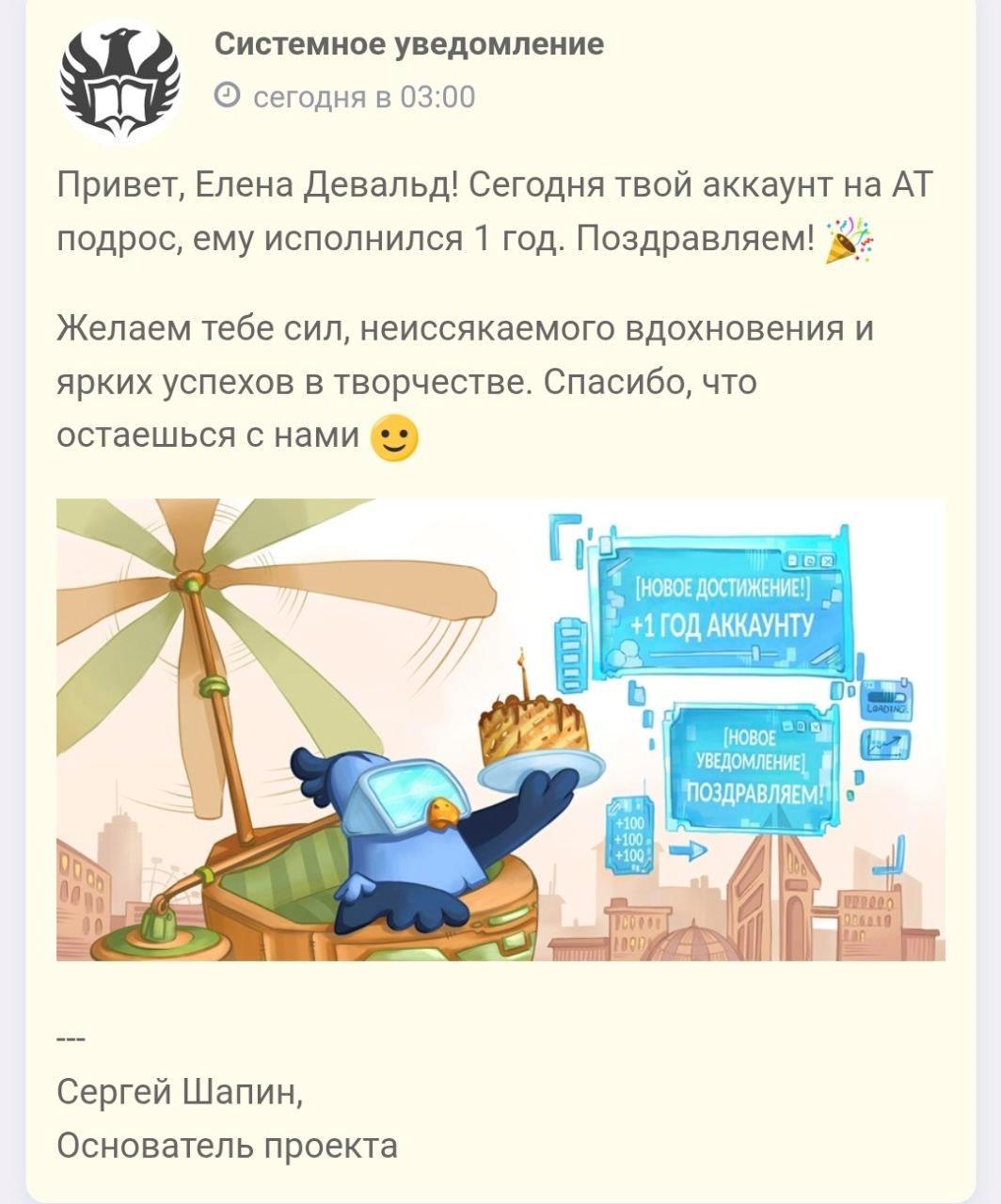 Автор: Елена ДевальдСегодня мне пришло милое поздравление с годовщиной аккаунта. Не верится, что я на АТ уже целый год! Как быстро летит время!