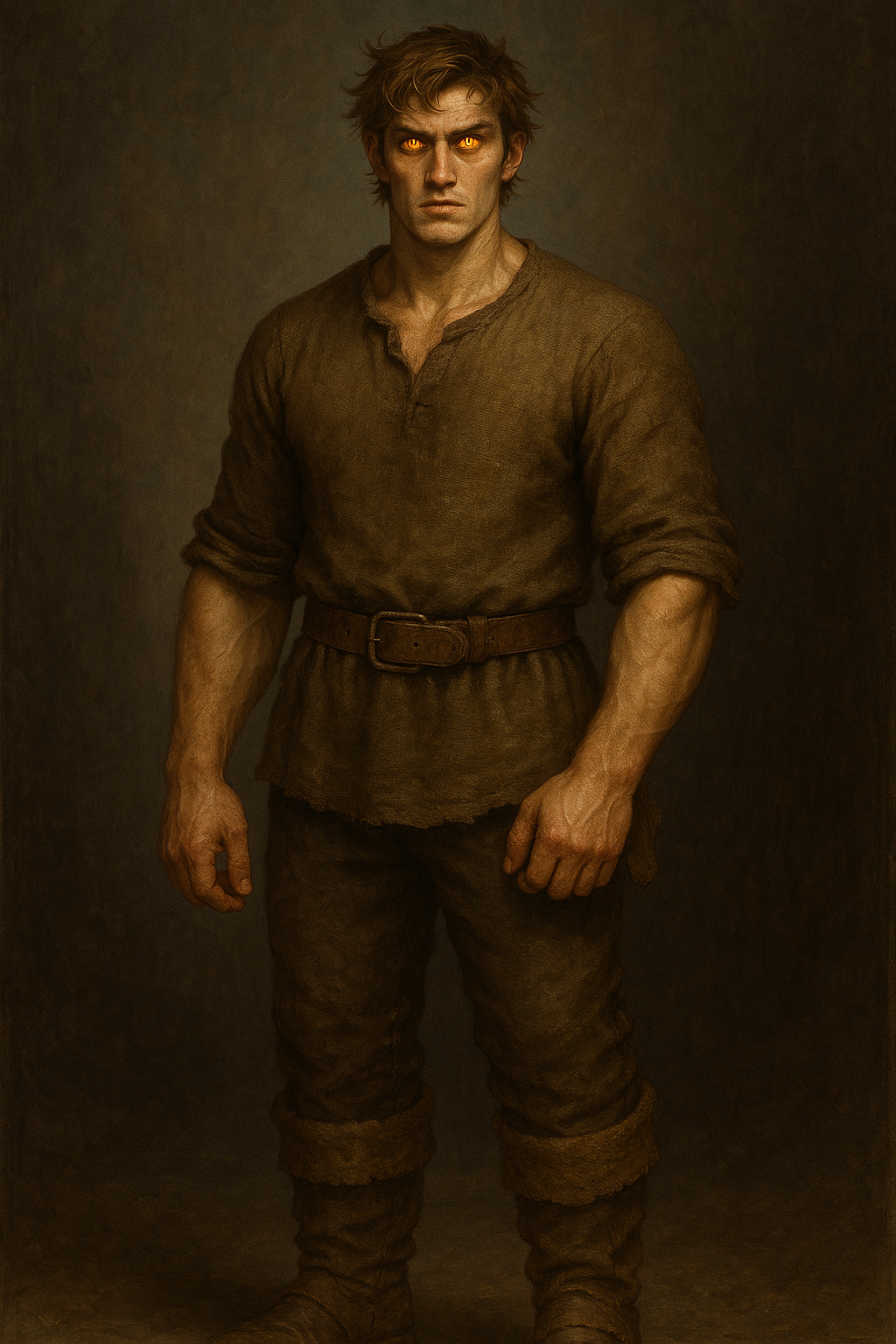 Он не герой из баллад, не облачен в сияющие доспехи. Его броня – грубая ткань потертой рубахи и штанов, его плащ – следы дорожной грязи на прочных сапогах. Он высок, строен, но в его плечах и руках чувствуется сила, выкованная трудом – сила человека, привыкшего к тяжести топора и долгим переходам. Темные, почти черные волосы, беспорядочные, как воронье гнездо после бури, падают на лоб, отмеченный загаром и усталостью.