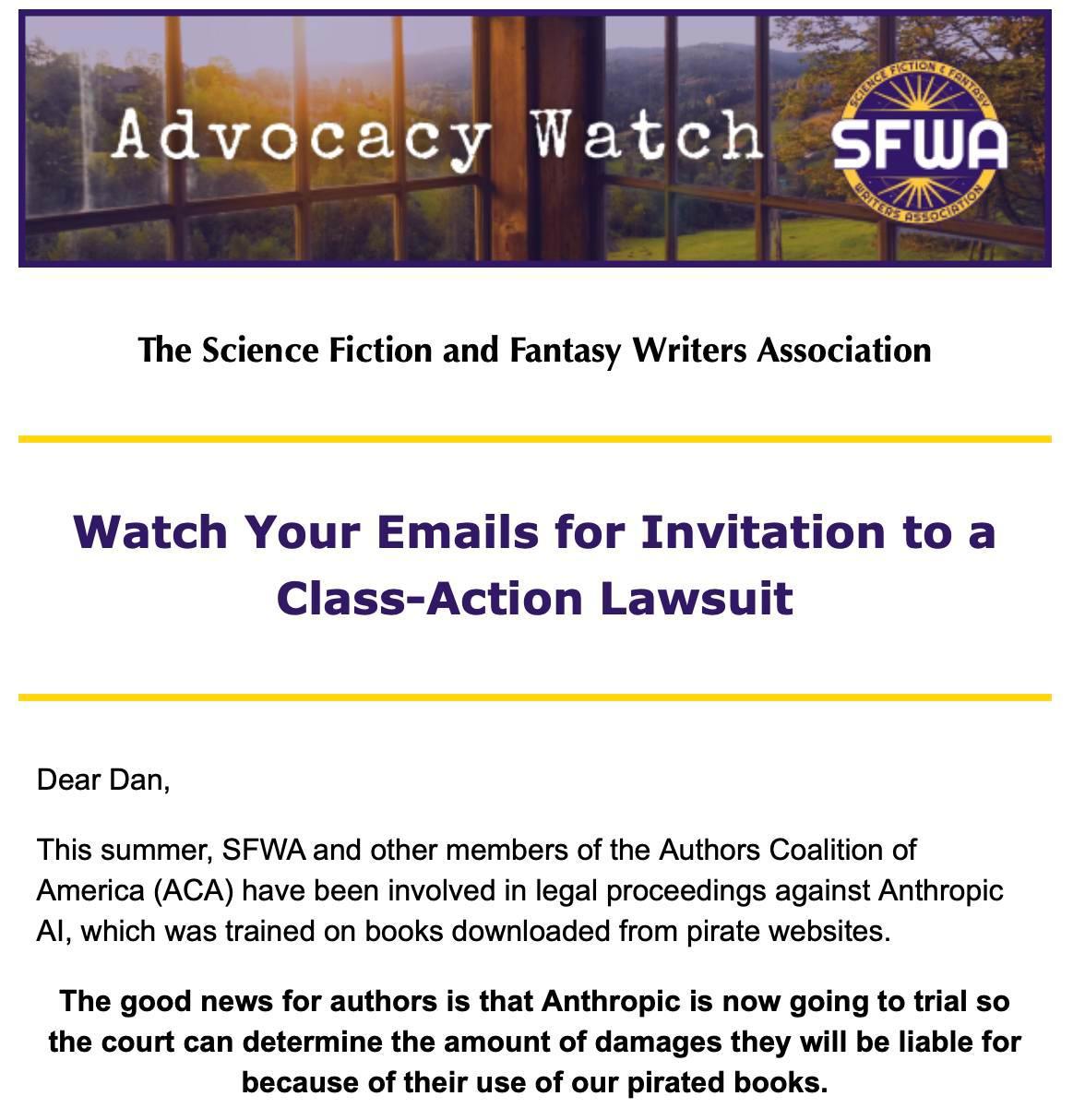 Суть того, что делает ассоциация в следующем. Этим летом SFWA и другие участники Authors Coalition of America (ACA) ведут судебное разбирательство против компании Anthropic AI, обучавшей свои модели на книгах, скачанных с пиратских сайтов. Суд признал, что использование таких книг не подпадает под понятие «fair use» (добросовестного использования). Дело перешло в стадию коллективного иска, чтобы определить сумму компенсации авторам.