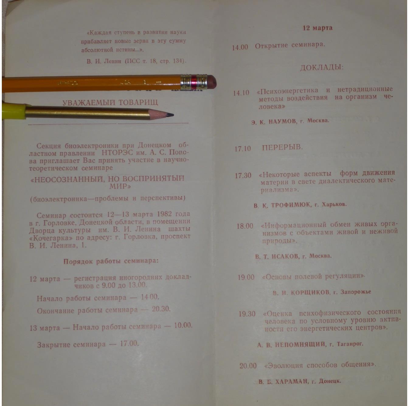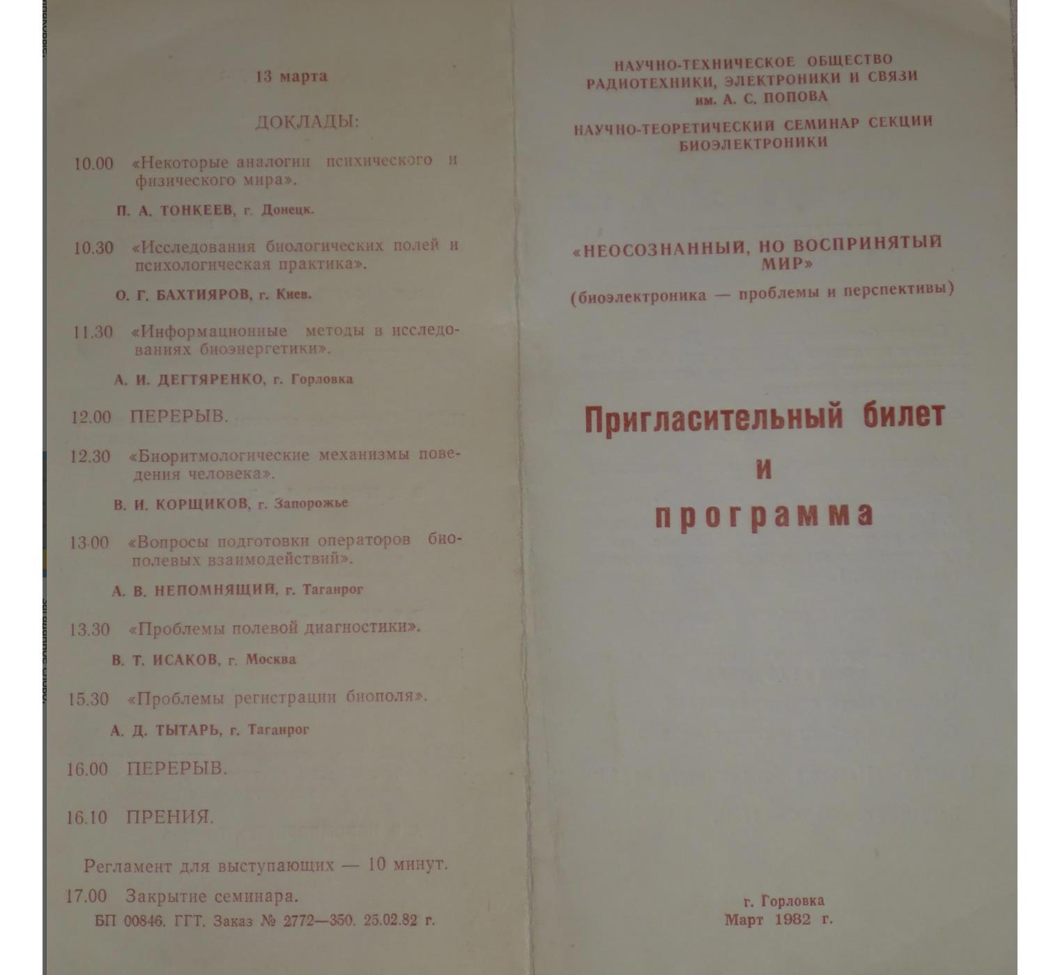 А Русик на очередном нашем с ним уроке подозрительно сиял. Понятное дело, никакая физика мне в голову не лезла. Видно же, что у него новость. Но он честно промучил меня многозначительным видом положенный для урока час и только потом начал рассказывать: «Есть такая организация по изучению аномальных явлений – Общество биоэлектроники имени Попова. Они устраивают свою первую конференцию». Выдержал паузу. «У нас в городе!» Рот у меня открылся. Но это было еще не все. Русик протянул мне пригласительный билет. На мое имя! Я задохнулась от восторга и благодарности и долго не могла ничего сказать. Произведенный на меня эффект явно превзошел все его ожидания.