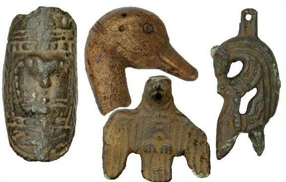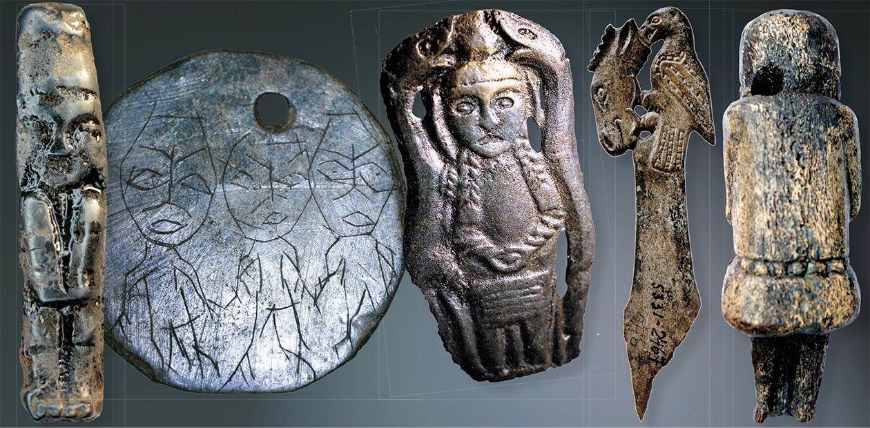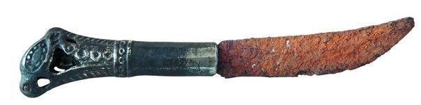 По виду – какие-то амулеты, но кто же их знает, на самом-то деле. Среди находок археологов сильно озадачил один нож. Мало того, что у него очень непростая ручка из бронзы, но и сам стальной клинок скован из слоёв стали с разными свойствами: