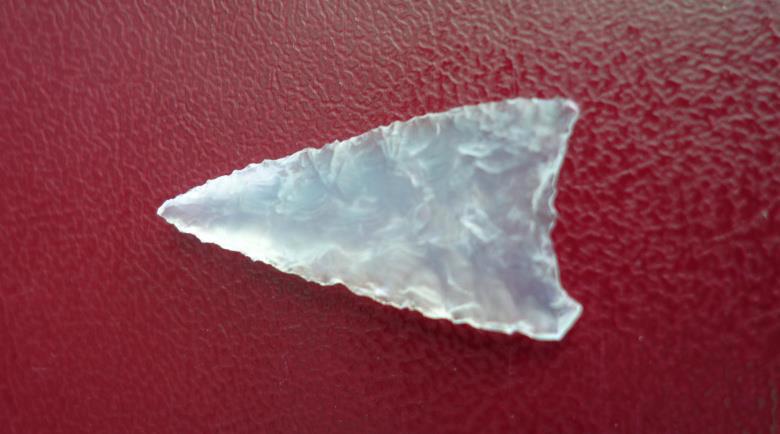 Ещё одну интересную мелочь нужно показать. Находка сделана ещё в 30-х годах среди других находок этой самой усть-полуйской культуры, и она действительно очень небольших размеров. Вот такой странный каменный наконечник стрелы, который отлично сфоткала Лариса Стрючкова: