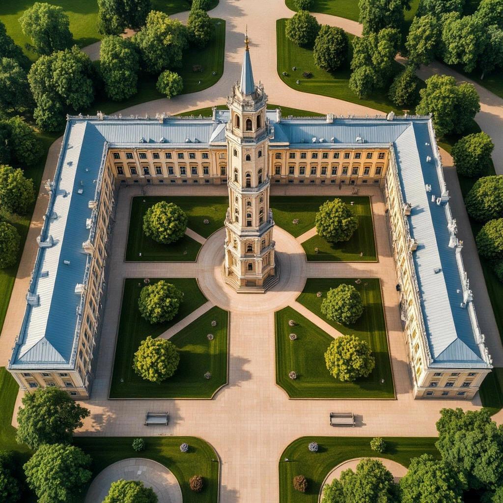 Примерно так выглядит большой жилой корпус с башней знаний в центре. Ширина жилого корпуса 22 метра. Длинна сколько надо. Высота 3 этажа или сколько надо :)