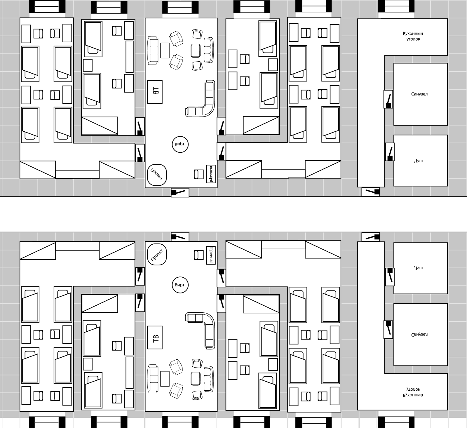 Вот что у меня получилось в качестве типичного блока на класс в Гамаюне. Из расчета 12+12. Девочки и мальчики через коридор.