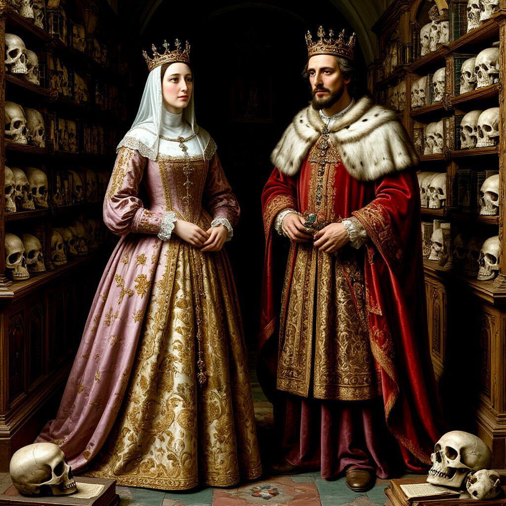 А это родители Екатерины, Фердинанд Арагонский и Изабелла Кастильская. В их браке родилось пятеро детей, включая Хуану Безумную, о которой шла речь в первой главе романа. Союз этой пары положил начало объединению Испании в единое государство, изгнанию нехристиан из тех земель и разжег пламя знаменитой "Испанской инквизиции". Все упомянутые лица мертвы к началу описываемых событий, но герои будут периодически вспоминать о них по тому или иному поводу. Интересующимся смотреть "Испанскую принцессу", сериал "Изабелла" производства Испании (перевод ужасен, правда). Про папашу - чуть-чуть у "Борджиа" от Франции-Германии-Чехии (НЕ КАНАДА!!!). Сериал - огонь.