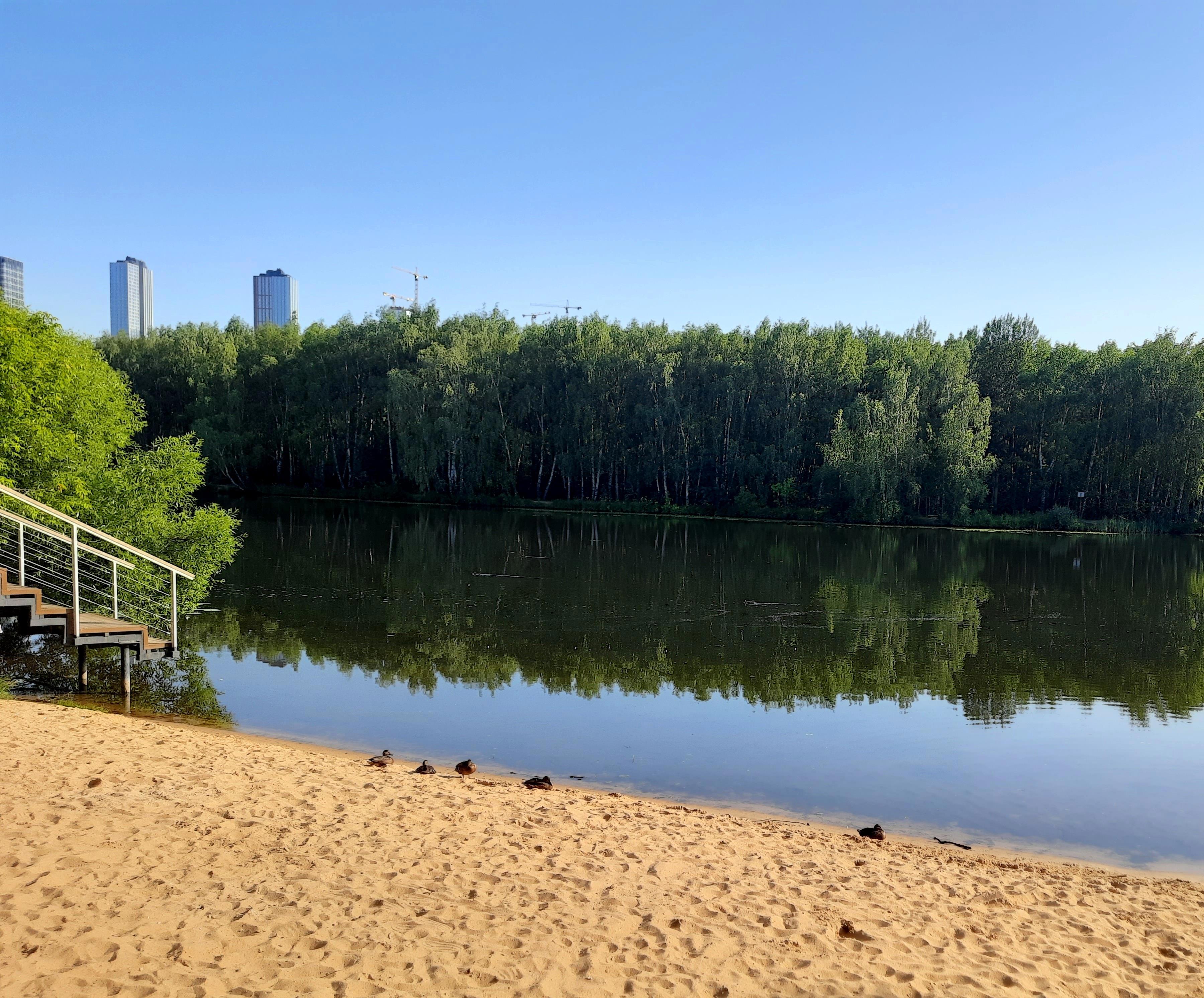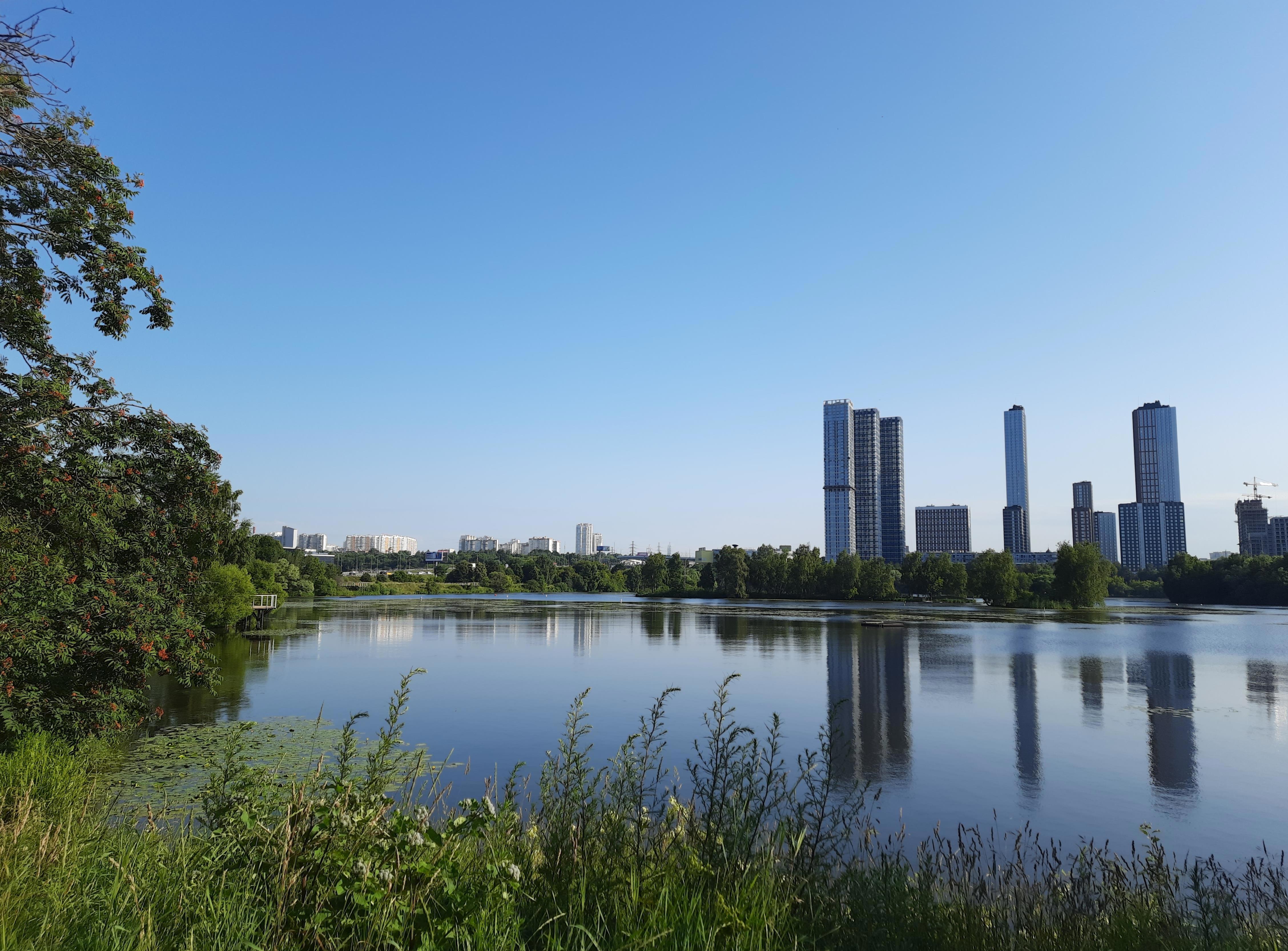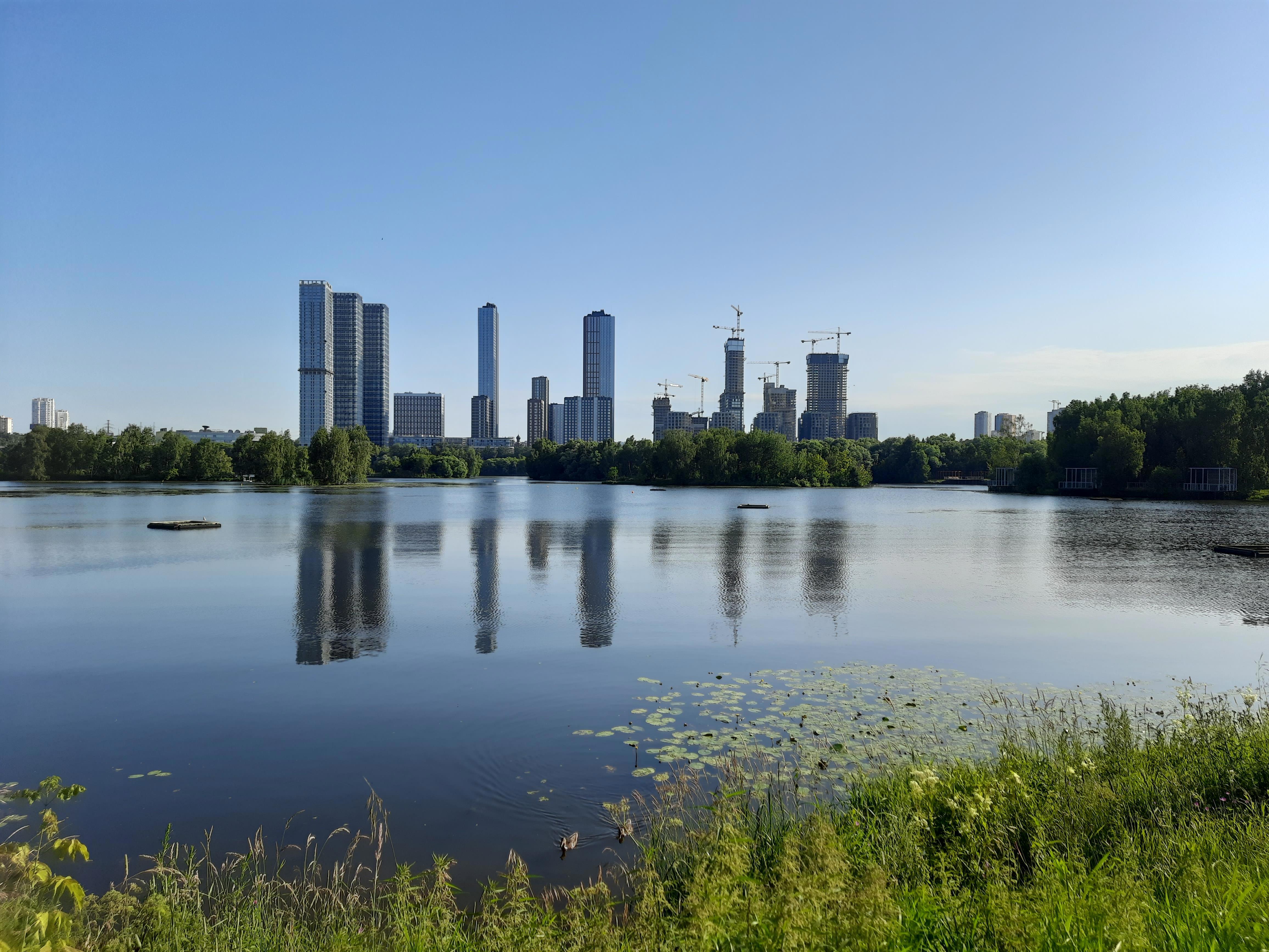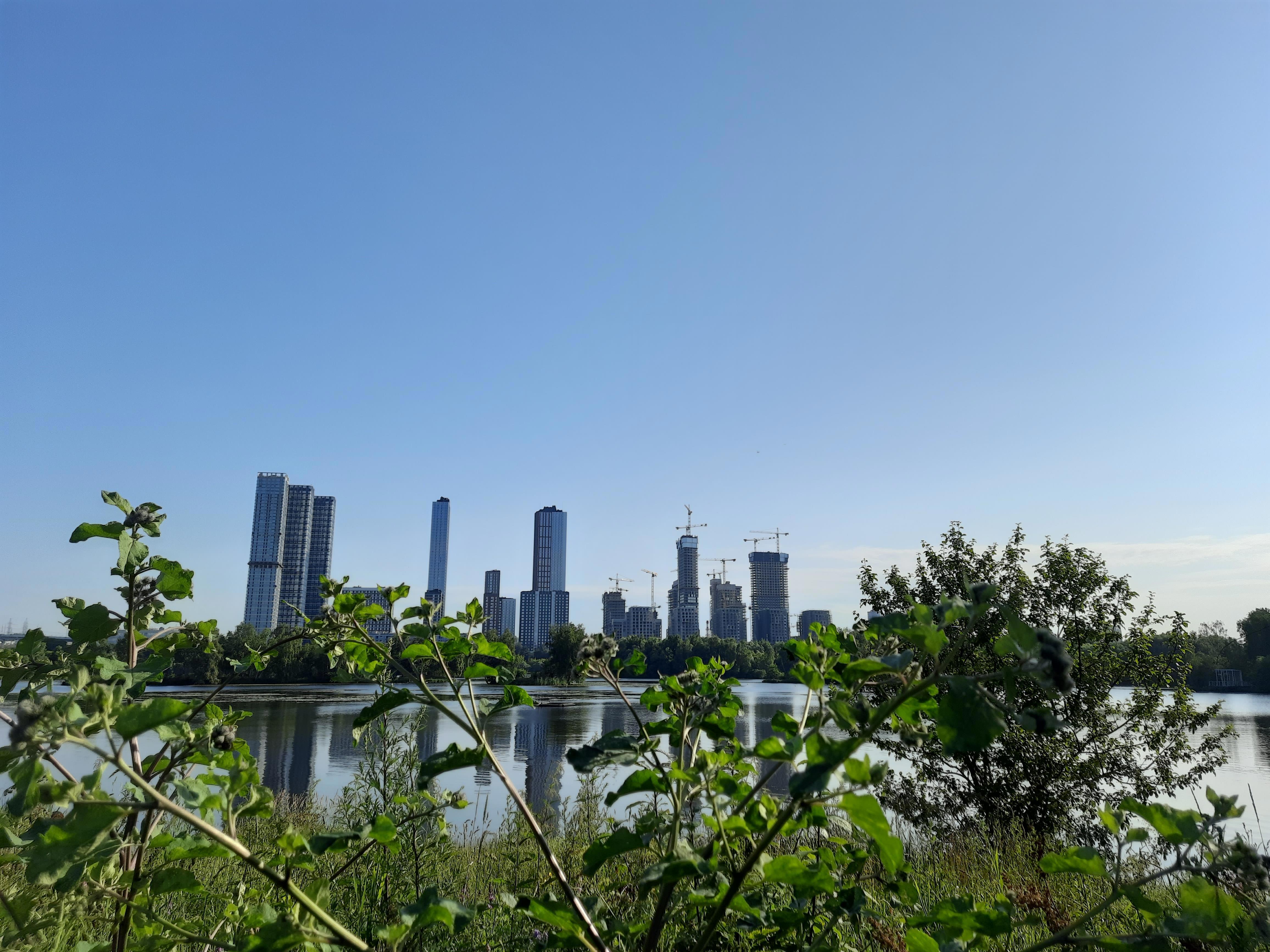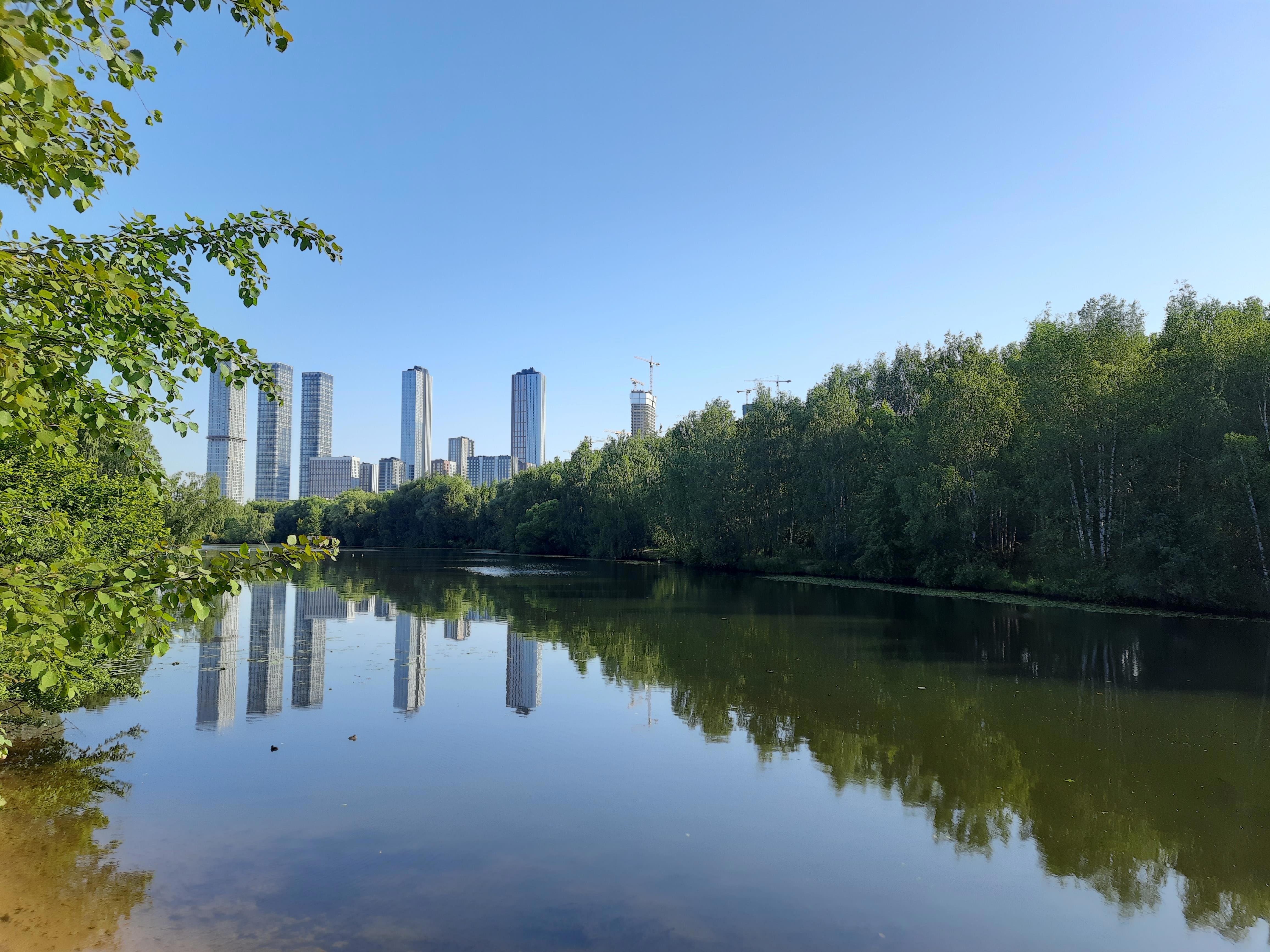 Набережную и парк в районе Строгино некоторое время назад привели в порядок. Смотрится замечательно. Всюду велосипедные и пешеходные дорожки, скамейки, фонари, указатели, детские и спортивные площадки, прокат инвентаря, навесы для мангалов. Но в этот раз я просто прошелся вдоль реки, насладился тишиной и приятной прохладой. Полюбовался на строящиеся дома в районе Тушино за рекой.