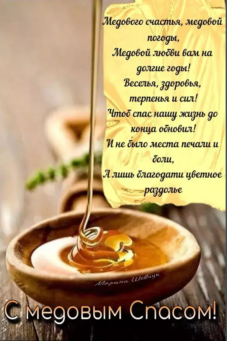 Сегодня не просто четверг перед пятницей, а настоящий праздник – Медовый Спас! От всего сердца поздравляю вас с этим чудесным летним праздником. Желаю вам тепла, сладкой, как мёд, любви, неиссякаемой надежды на лучшее и исполнения всех ваших самых заветных желаний.