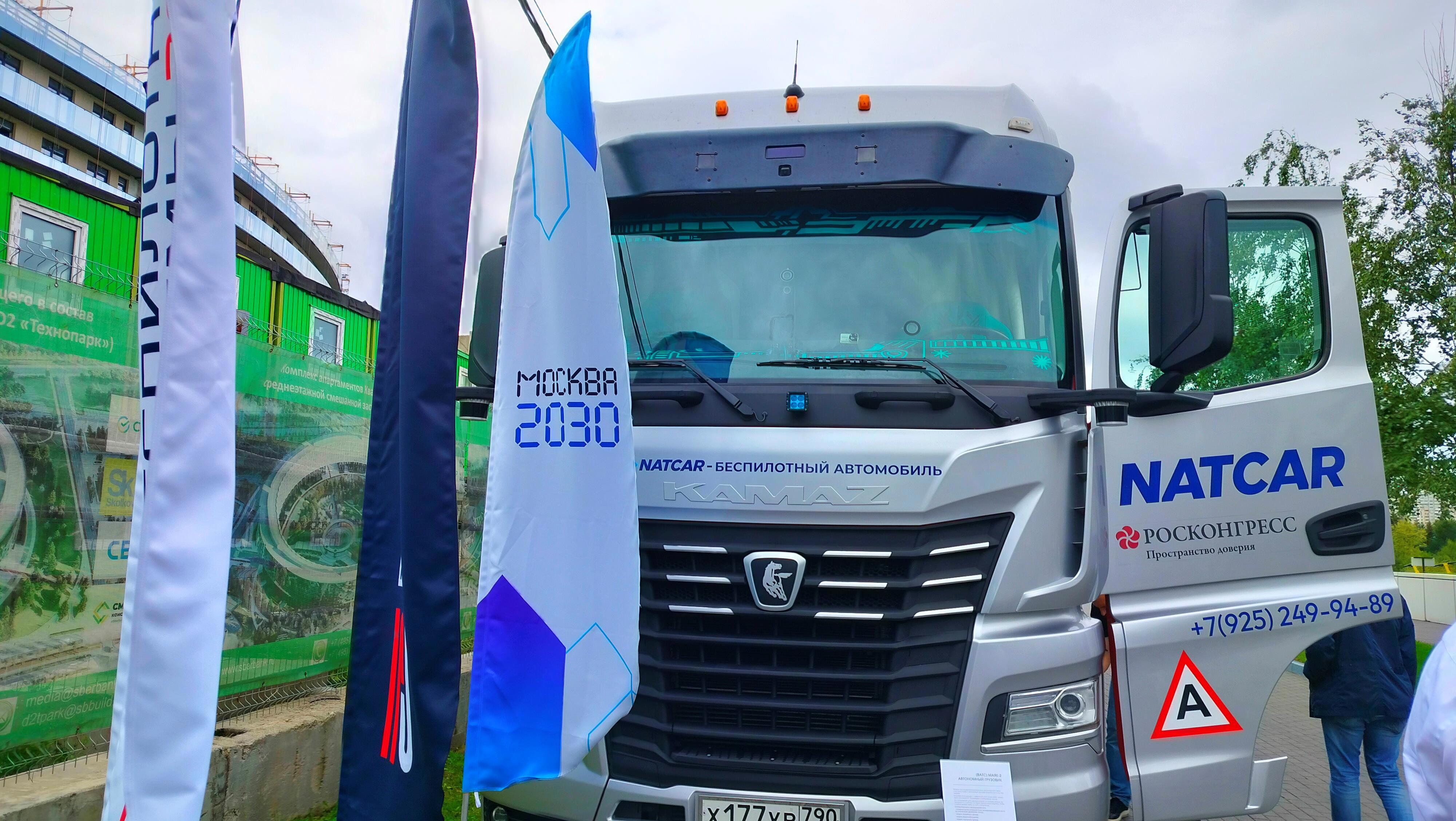 Удивительно, но народу не так много, как я думал, зато много интересной техники. На улице у входа стоит беспилотные грузовик от Камаза. Правда, пока это так называемое третье поколение, где обязательно должен находится человек.