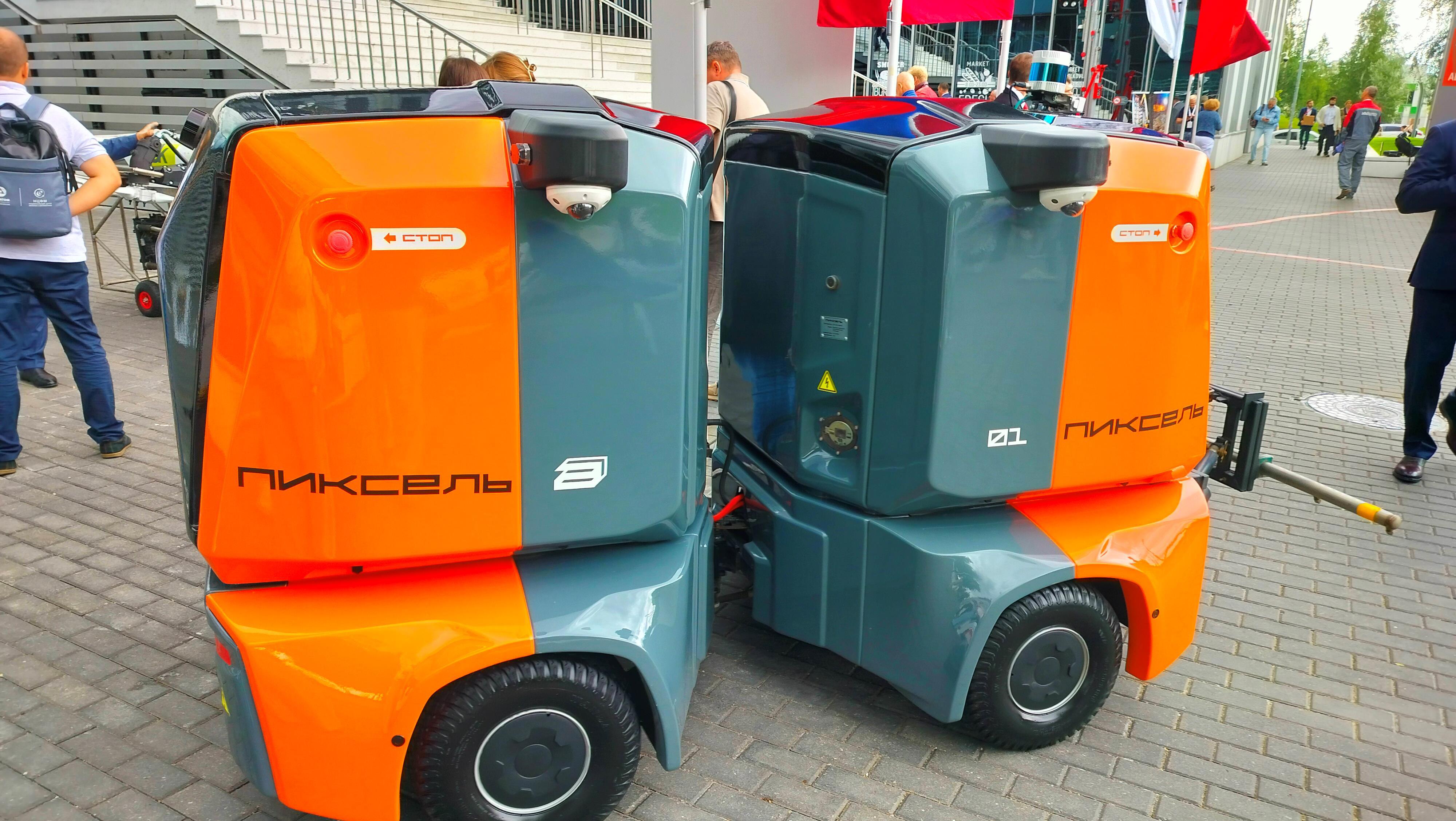И суперски выглядящий робот-убощик, Пиксель. Такие в Москве уже вовсю шуруют в парках, сметая мусор и снег.