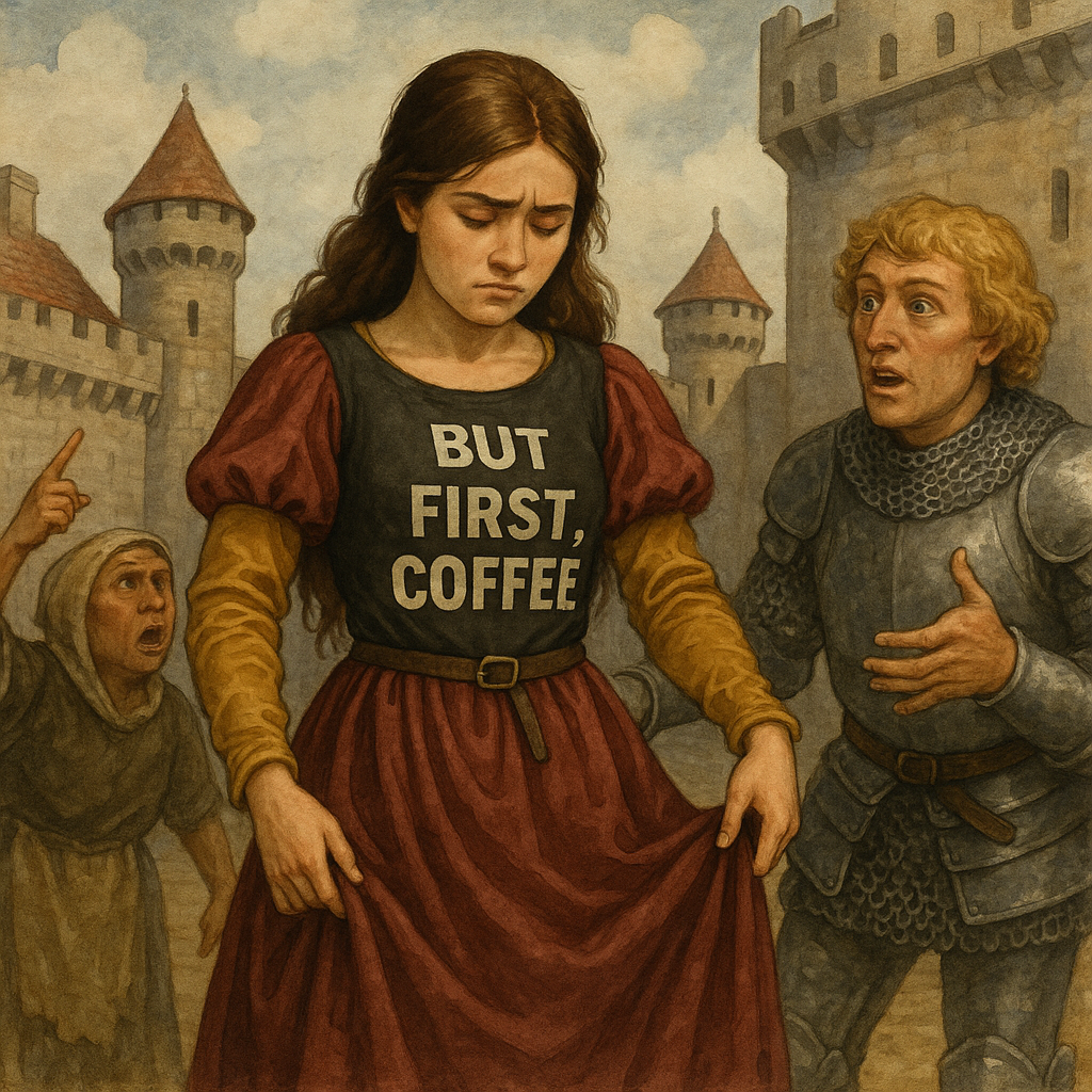 Я стояла посреди двора в своих джинсах и футболке с надписью "Но сначала кофе", и пыталась понять, почему меня принимают за пророчицу. Оказалось, местная гадалка предсказала появление девы в странных одеждах, которая "ноги свои обтянет тканью как вторая кожа". Спасибо, скинни джинсы.