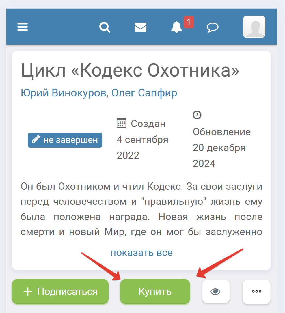 - покупка на цикл и скидка работает, если в цикле не меньше трех платных книг;