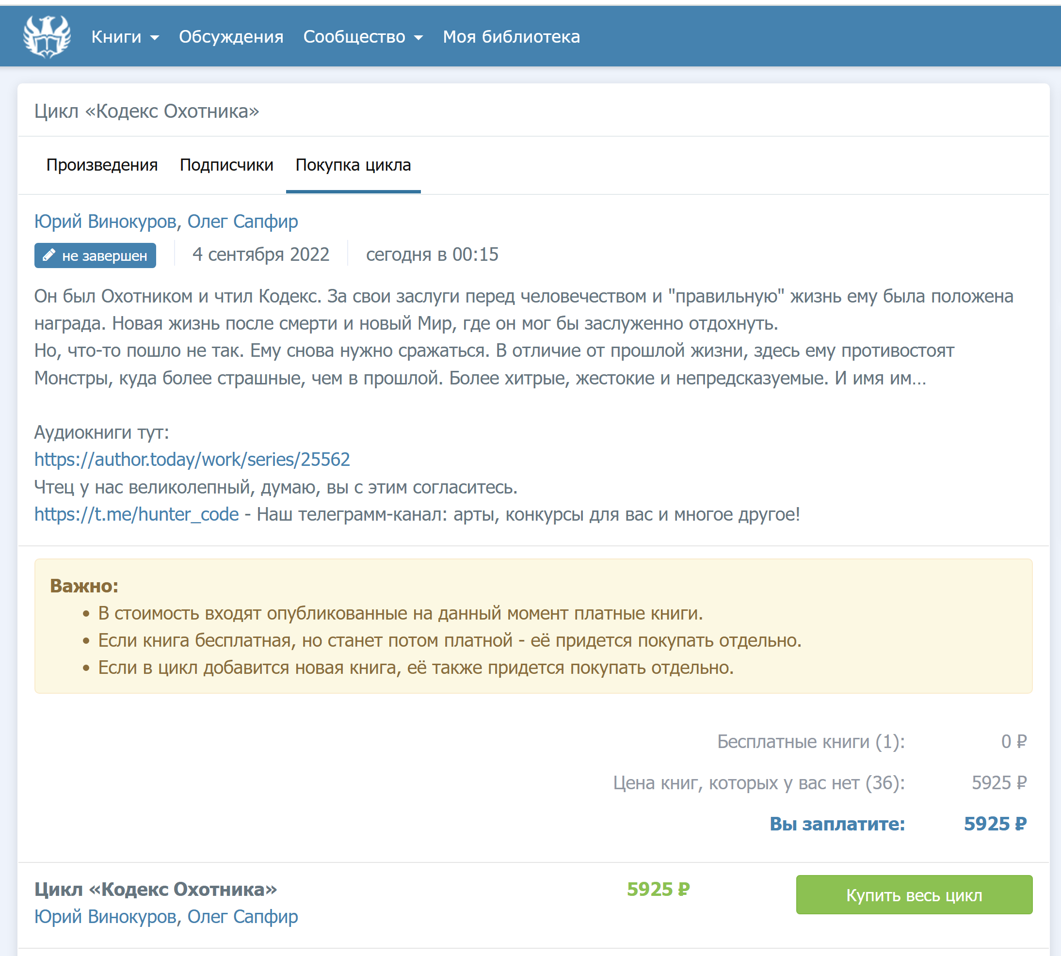 - покупаются только опубликованные книги. Если цикл будет продолжаться - покупать продолжение придется отдельно;