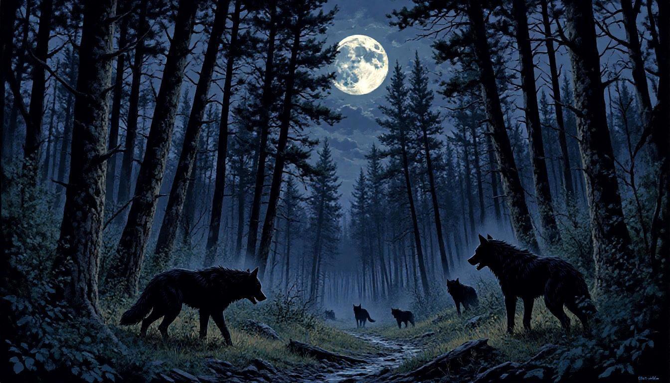 Все замерли будто в плохой трактирной сценке, с перепутавшимися ролями. Умные звери, расставившие ловушку, глупые люди, угодившие в капкан, бессмысленные попытки выбраться и дикая охота, накрывающая все вокруг. Серебристый свет огромной, полной луны, освещавшей ночной лес, делает эту сцены еще более нереальной, остановившейся, волшебной в своей неправильной сути.