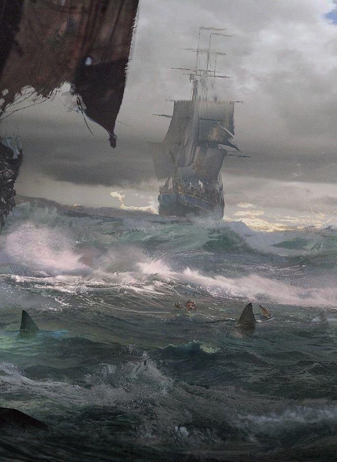 На море абсолютно ни черта не видно. Воздух наполнен пеной и брызгами. Всё море покрыто пеленой из полос пены. Волны возвышаются до двадцати метров, а то и выше.