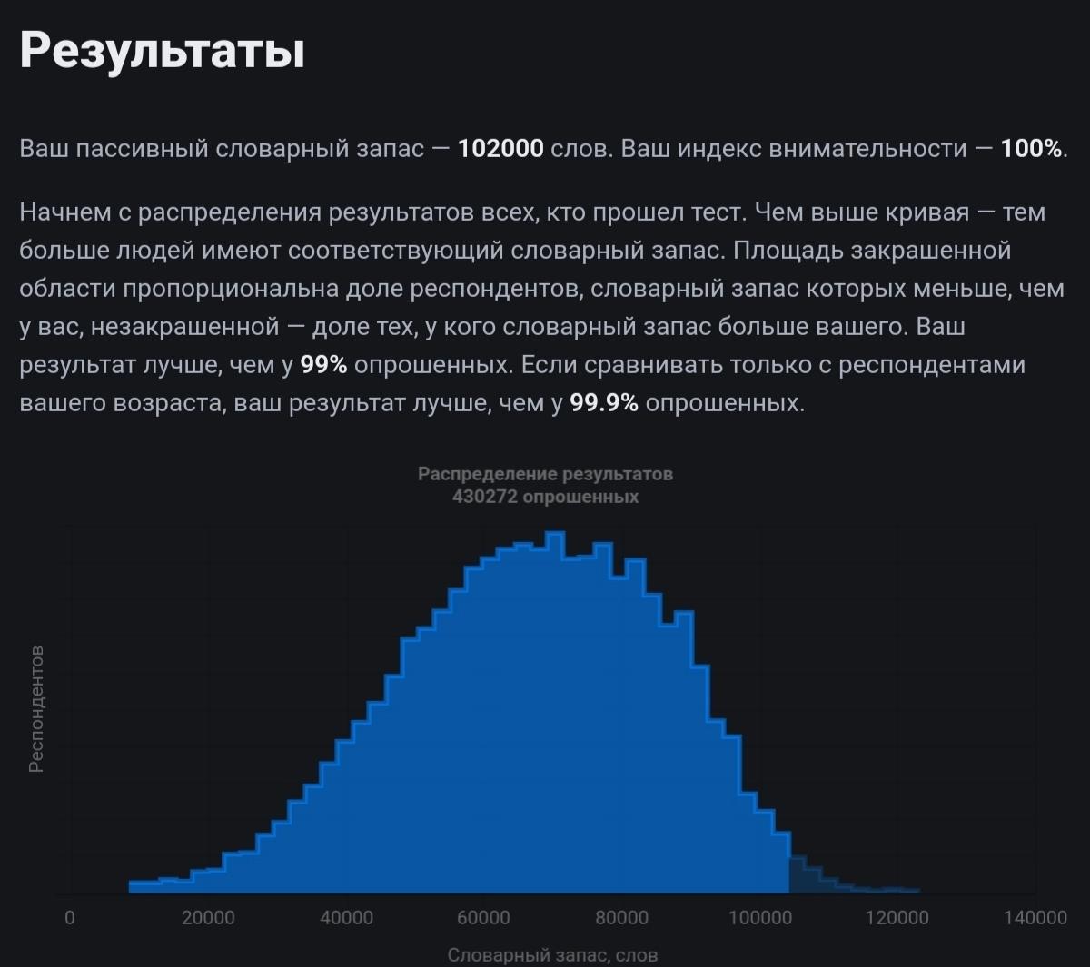 В качестве иллюстрации к посту я использовала результат моего же теста на размер пассивного словарного запаса. Если вам вдруг тоже захочется попробовать себя в угадывании слов (а слова там есть ОЧЕНЬ редкие, которые я знаю исключительно благодаря старославу и исторической грамматике на филфаке, хе-хе), то вы можете попробовать себя вот тут: