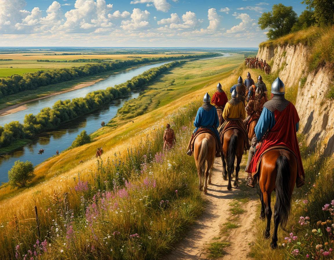 Картинка 16. Граф Крон во главе небольшого отряда отправляется на поиски селения под названием Хаврен, в котором живёт очень нужный ему человек. И после долгих блужданий по тёмным лесам Срединных гор они выходят в речную долину. Очень милая картинка, по-моему. Прям лето и наша Средняя полоса.
