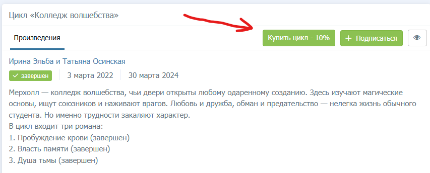Портал АвторТудей внедрил возможность покупки циклов целиком, нажатием одной кнопки! И предоставил авторам возможность дарить читателям скидку при покупке сразу всего цикла.