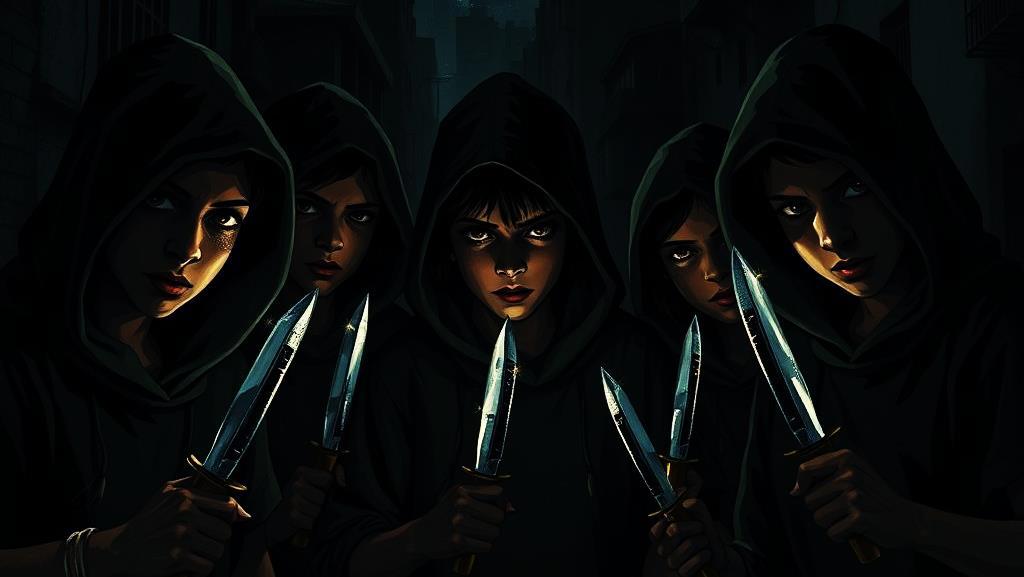Внезапно его накрыла тень. Из-за угла вышли пятеро подростков. Самый высокий из них вертел в руке нож. Лезвие блеснуло в руке. В глазах вора читалась животная агрессия и злоба.