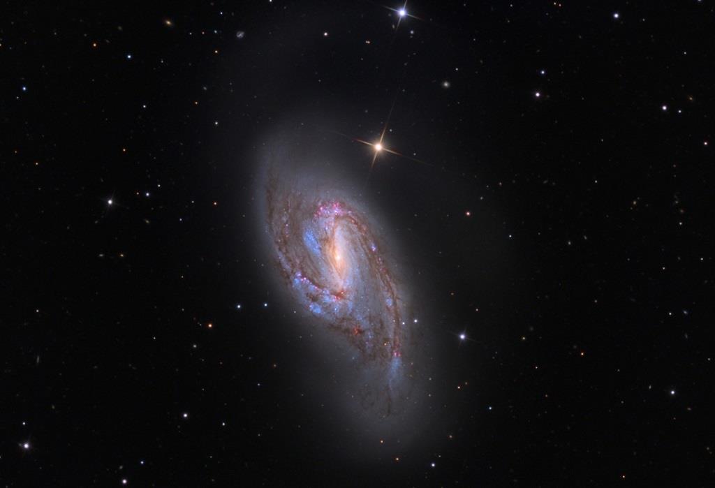 Спираль с маленькой перемычкой. Вместе с двумя соседками, также спиральными галактиками, М66 входит в "трио Льва":