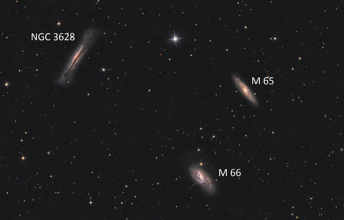 Несколько искаженная форма спиральных рукавов объясняется недавним (по астрономическим меркам) гравитационным взаимодействием с одной из соседок, предположительно с более крупной NGC 3628. Кстати, М66 тоже не маленькая, ее размеры примерно соответствуют размерам нашей Галактики.