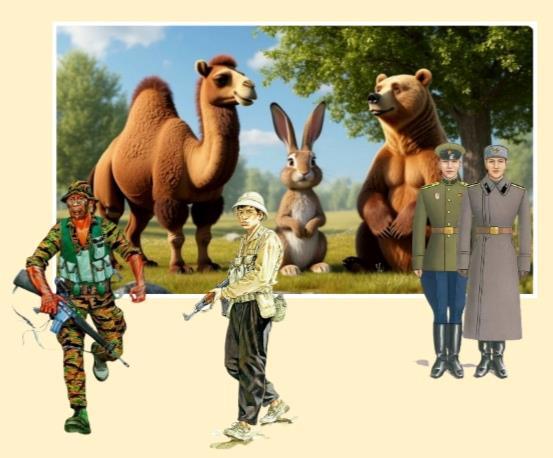 Вместо зайца у меня там был Южновьетнамский прислужник империализма, а медведем там у меня был американский оккупант, ну а загонщиками, естественно доблестные Вьетконговцы Дедушки Хо.