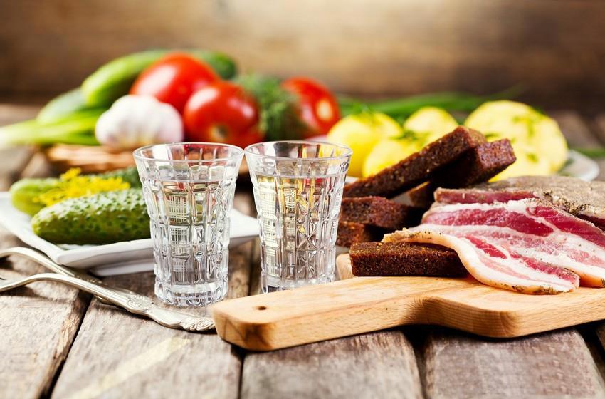 Вечер очередного дня. Захмелевший немец, замотанный в простыню, поедая сало с луком, говорит: